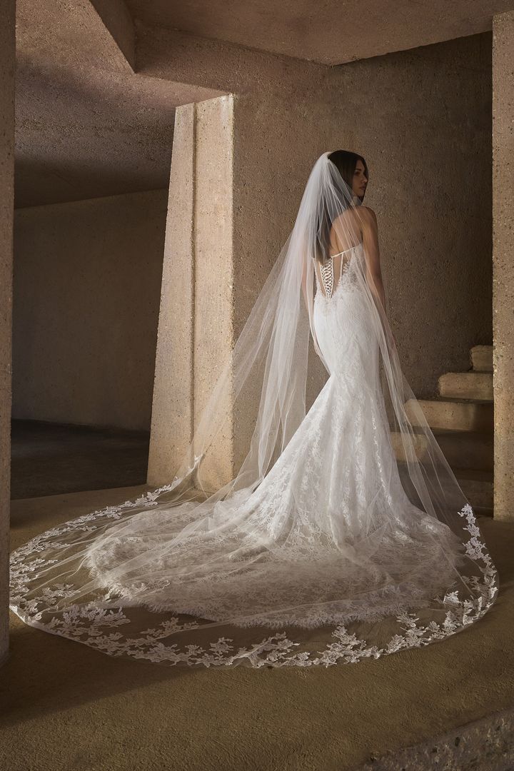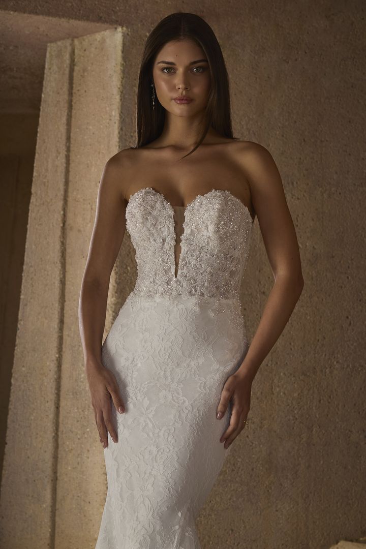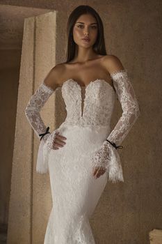 Where structure meets softness, Gwendolyn mirrors the modern bride—bold, unyielding, yet effortlessly romantic. She is a mesmerizing 2-in-1 dress style, featuring a strapless fit-and-flare silhouette with a plunging sweetheart neckline. The gown is fashioned from stretch chiffon and tulle, lavishly adorned from neckline to hem in Chantilly lace, beading, and embroidery. Elevate Gwendolyn with her optional sleeves (SL054), crafted from Chantilly lace with a flounced cuff and scalloped edge. This stunning accessory introduces an extra layer of enchantment with two velvet bow colors, ivory or black, that tie delicately around the bride’s wrists. Style with her matching cathedral veil (2609V), offered separately.