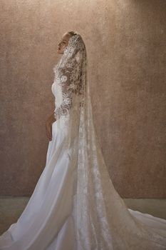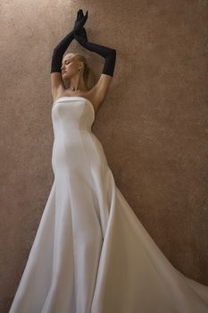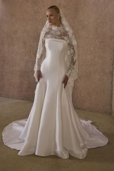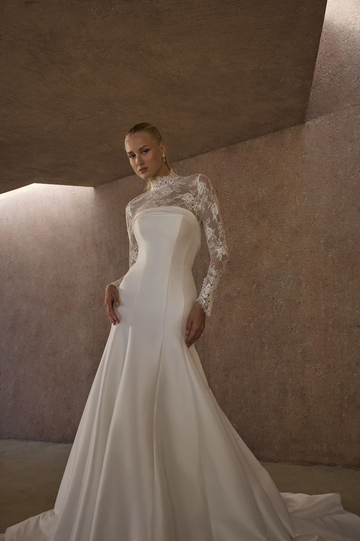 Set against the moody, intense lines of a brutalist architectural masterpiece, Livia is a gown designed for the bride who steps into her future with fierce confidence. This strapless fitted A-line silhouette is sculpted from sleek Stretch Mikado, featuring a straight-across neckline with a folded lapel, evoking a sense of power. Princess seams contour the body, creating a commanding presence, while a row of cascading covered buttons runs down the back to the hemline, balancing modern minimalism with classic bridal elegance. The 2-in-1 styling allows for personalization—pair with the Chantilly lace bodysuit (BD001) for a bold contrast, add glove accessories (GL009-1 or GL009-2) for a striking touch, or complete the look with the matching cathedral veil (2613V), each offered separately. As the golden hour light spills through the angular concrete forms, this gown stands as a symbol of fearlessness facing an unknown journey ahead.