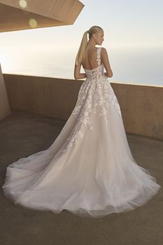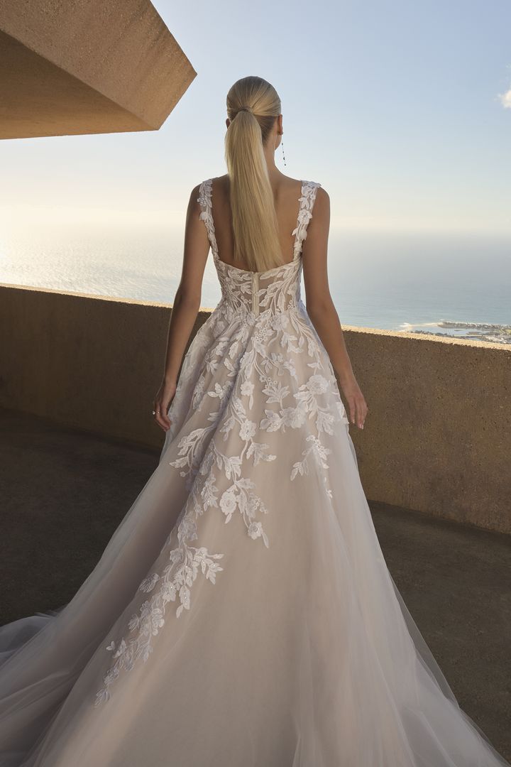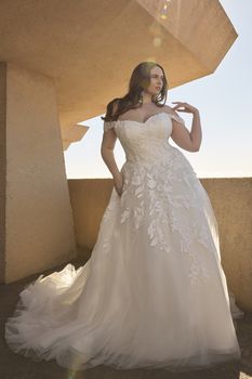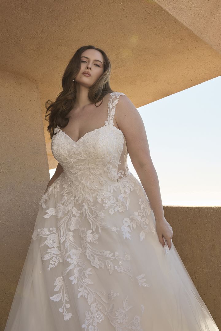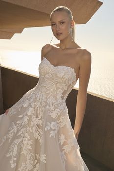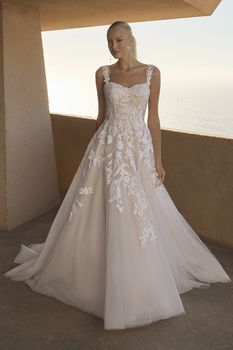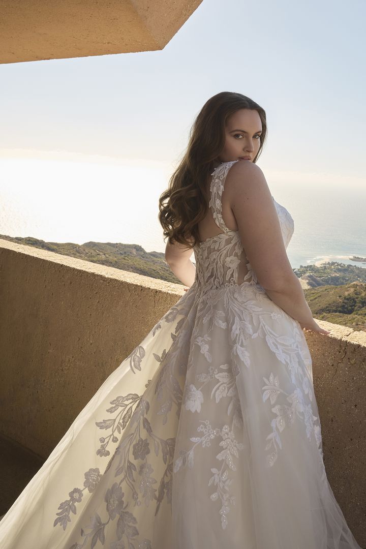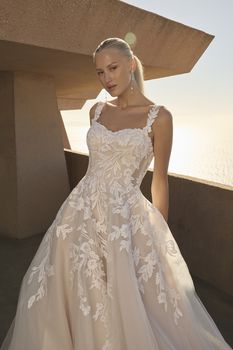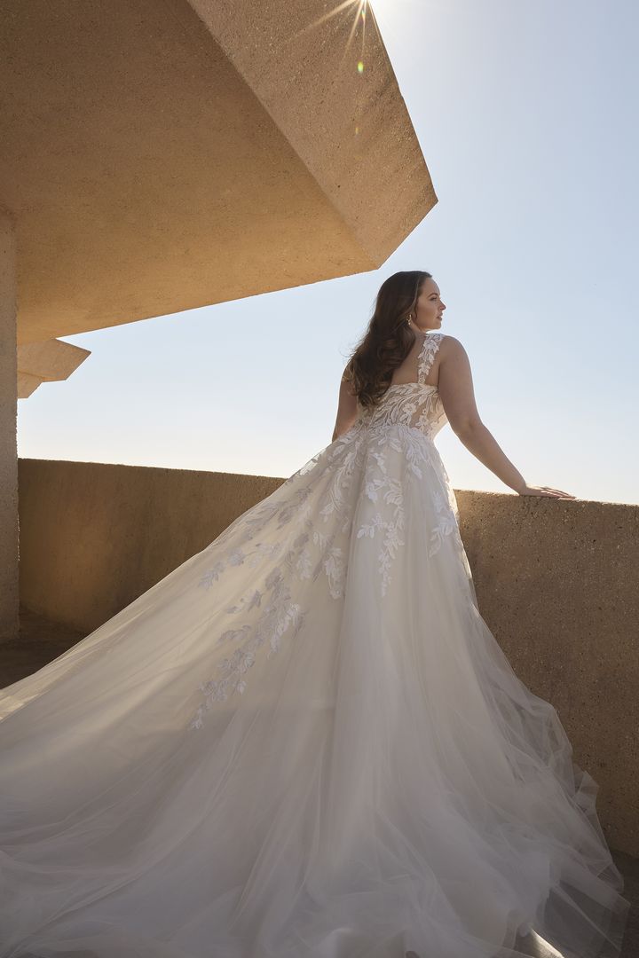 The Larissa ball gown is a vision of softness set against the striking intensity of brutalist architecture in Malibu. With her sweetheart neckline and detachable tank straps, the bride can seamlessly transition between strapless, on, or off-the-shoulder looks, mirroring the interplay of tradition and modernity. Layers of tulle and floral lace appliqués with sequins create a luminous, ivory silhouette. Her skirt flows into a cathedral-length train allowing the gown to move with effortless grace. Complete the look with the matching knee-length veil offered separately, (2618V).