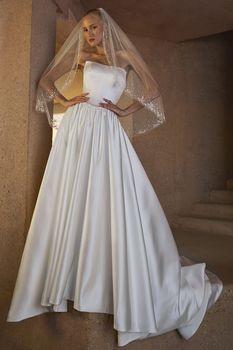 Expertly tailored from luxe satin and lining, the Jovienne strapless A-line gown features a pointed scoop neckline and Basque waist. She embodies artistry and emotion, set against a backdrop of fearless modernity. Each fold of the cathedral-length train catches the light, highlighting the gown’s timeless bridal craftsmanship. For a breathtaking finish that merges elegance and innovation, style with her matching fingertip veil offered separately, (2619V).