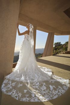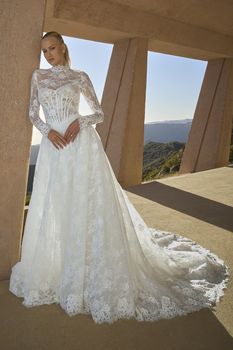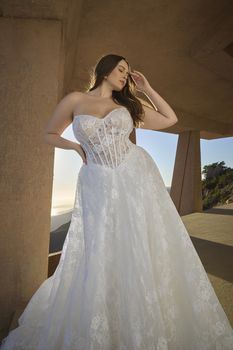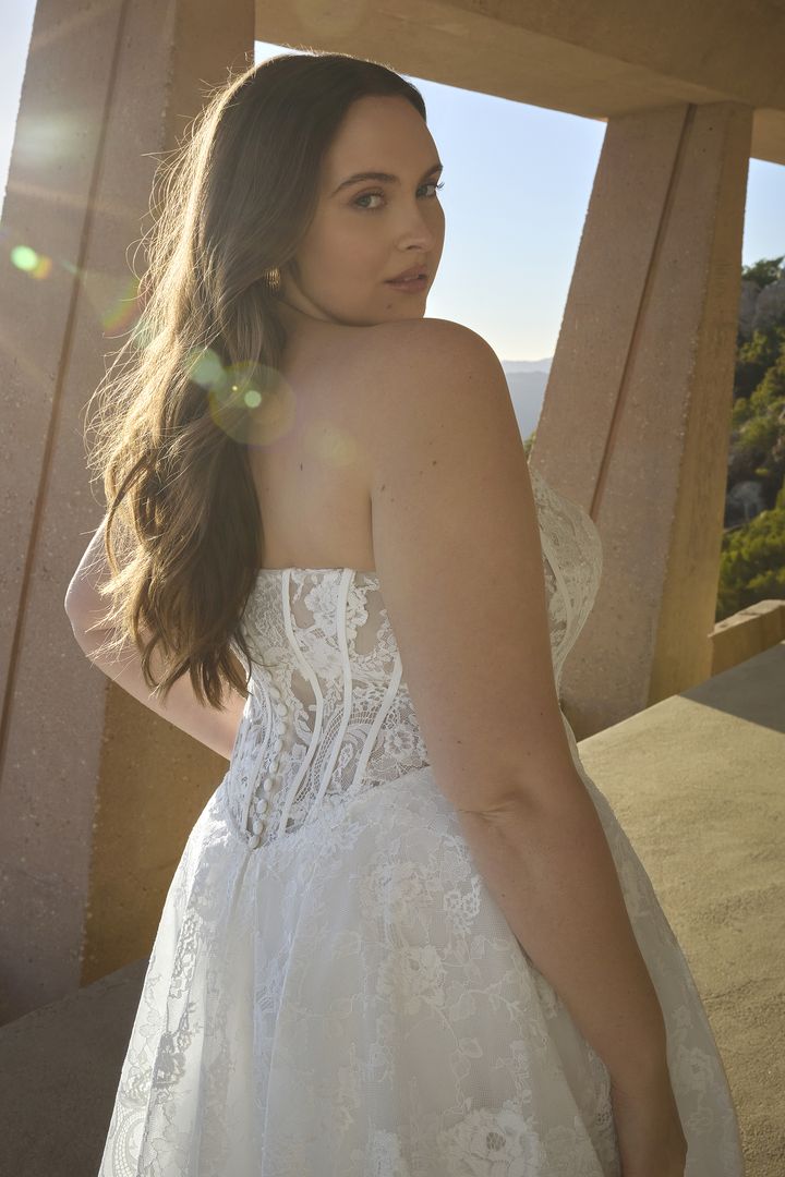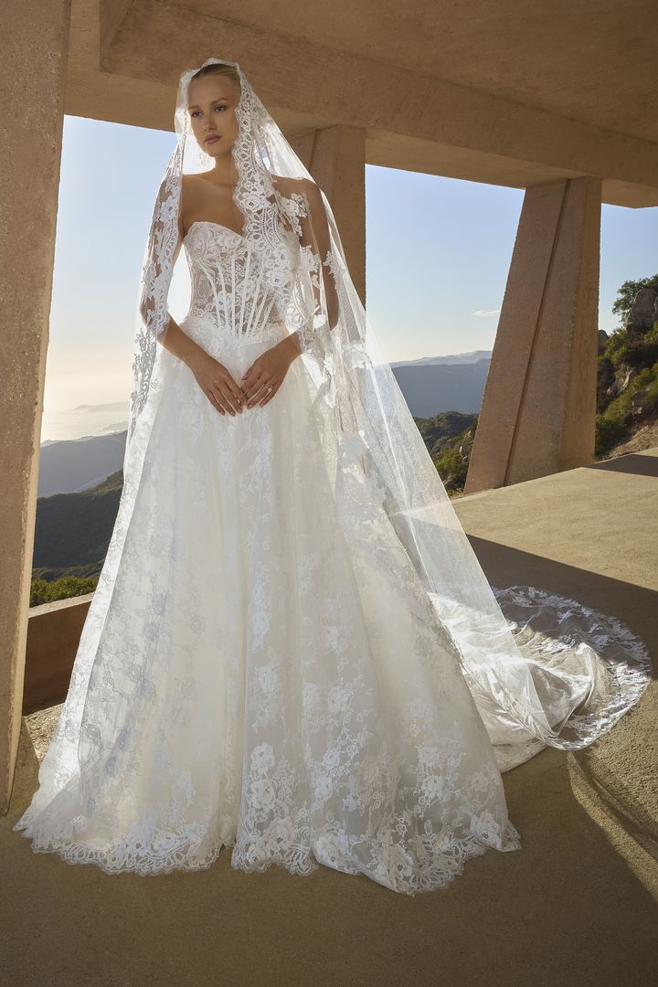 Embrace a daring yet timeless aesthetic with the Geneva strapless A-line gown, showcasing a sweetheart neckline, Basque waist, and exposed boning—all fashioned from stretch lining, tulle, and Chantilly lace. On her wedding day, the bride stands on the edge of eternity with her partner, unafraid of the unknown, as her cathedral-length train echoes the grandeur of her surroundings. For a striking two-in-one option, pair Geneva with the optional bodysuit (BD001), crafted from sheer Chantilly lace with a scalloped turtleneck collar, long sleeves with scalloped cuffs, and covered buttons—versatile enough to wear with styles 2621 or 2613. The interplay of structure and softness heightens the gown’s bold sophistication, designed for those who step fearlessly into forever. Complete your look with the matching cathedral veil offered separately, (2621V).
