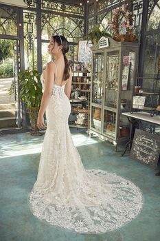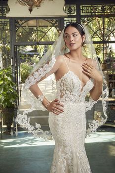 Love is in the details, and Style 2488 Nicole by Casablanca Bridal is simply overflowing with them. Exude effortless glamor with a delicate plunging neckline, lace motifs, and beaded spaghetti straps in this ultra-flattering fit and flare that embraces your feminine form. Chic yet comfortable in a dreamy stretch chiffon, the overlace with beading and sequins flows elegantly into a lavish 63" train. Continue the vision of grace and glamor with Nicole's accompanying veil adorned with intricate lace motifs.