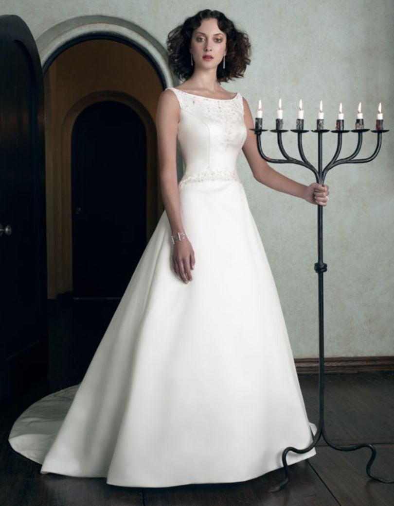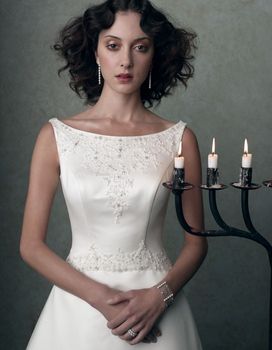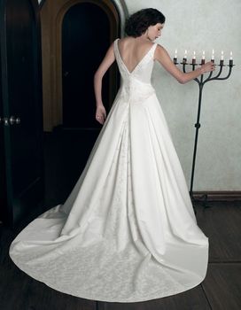 The bateau neckline of this regal gown is adorned with hand beading, which continues down the center of the bodice, and compliments that used on the slightly inverted waistline. Deep "V" neckline in the back accentuates the multi box pleats used at the princess seams and center back seam along with the beautiful beaded design throughout the semi-cathedral train of this distinctive gown