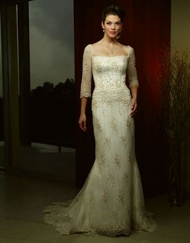 Gowns / Regal Romance Style 1874 Prev Next Gowns / Regal Romance Style 1874 This season’s cover dress! Sophisticated square neckline defines lovely sheer 3/4 lace sleeves. More traditional elements are the mermaid cut skirt along with semi-chapel train. Romantic scalloped hem lace and delicate floral lace throughout the dress make this a timeless creation. Fabric: Beaded Lace over Satin Available In: Ivory/Multi, White/Multi, White/White, Ivory/Ivory Shown In: Ivory/Multi Find a Store Share