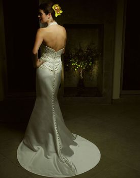 Gowns / Midnight Majesty Style 1873 Prev Next Gowns / Midnight Majesty Style 1873 Stunning halter dress has a mermaid plain skirt and beautiful French lace bodice. Gathered sash at the waist and alternating satin and beaded buttons down the semi-chapel train add to the beauty of this gown. Fabric: Sleek Satin, French Lace and Silk Sash Available In: Ivory/Gold Shown In: Ivory/Gold Find a Store Share