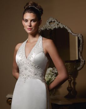 Gowns / Timeless Moments Style 1921 Prev Next Gowns / Timeless Moments Style 1921 This lovely gown has a beautiful fit-and-flare silhouette with beaded appliques lining the halter neckline. The beaded appliques continue around the waist to a "V" shape in the back for a slimming effect with Swarovski crystal buttons captivating the semi-chapel length train. Fabric: Sleek Satin Available In: Ivory, White, Diamond White, Gold, Platinum, Champagne Shown In: Ivory Find a Store Share