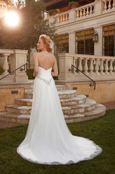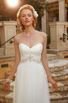 Gowns / Golden Hour Style 2041 Prev Next Gowns / Golden Hour Style 2041 Layers of Soft Tulle over Parchment Organza with Swarovski Crystal and Freshwater Pearl appliqué band accented with pleated organza sweetheart neckline and crystal buttons on bodice. Fabric: Soft Tulle over Parchment Organza Available In: Ivory/Silver, White/Silver Shown In: Ivory/Silver Find a Store Share