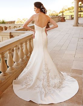 Gowns / Golden Hour Style 2042 Prev Next Gowns / Golden Hour Style 2042 Strapless pleated crisscross bust on sleek satin fit and flare gown with Swarovski Crystals, silver embroidery, rhinestones, and pearls cascading down front of gown. Beaded buttons extend to top of embroidery on the train. Fabric: Duchess Silk or Crystal Satin bodice, with Beadwork and embroidery on Sleek Satin skirt Available In: Ivory/Ivory/Silver, White/White/Silver, Diamond White/Diamond White/Silver Shown In: Ivory/Ivory/Silver Find a Store Share