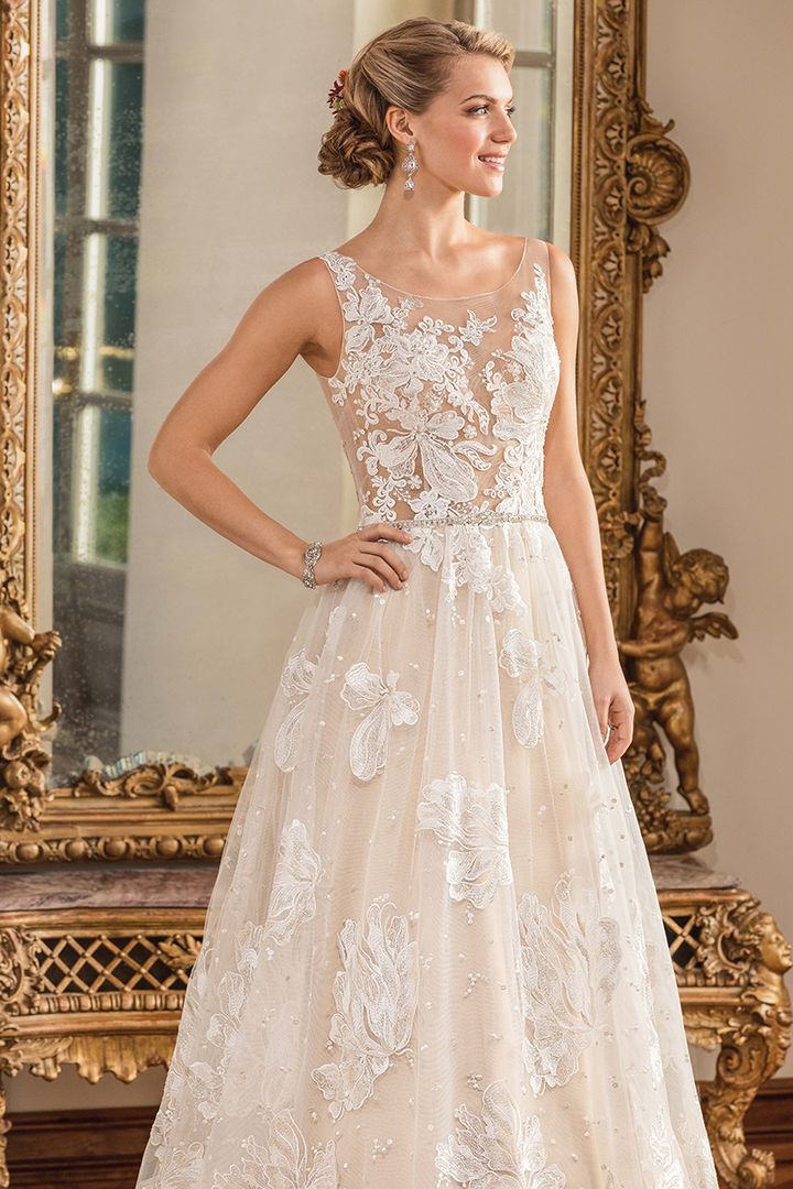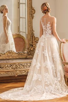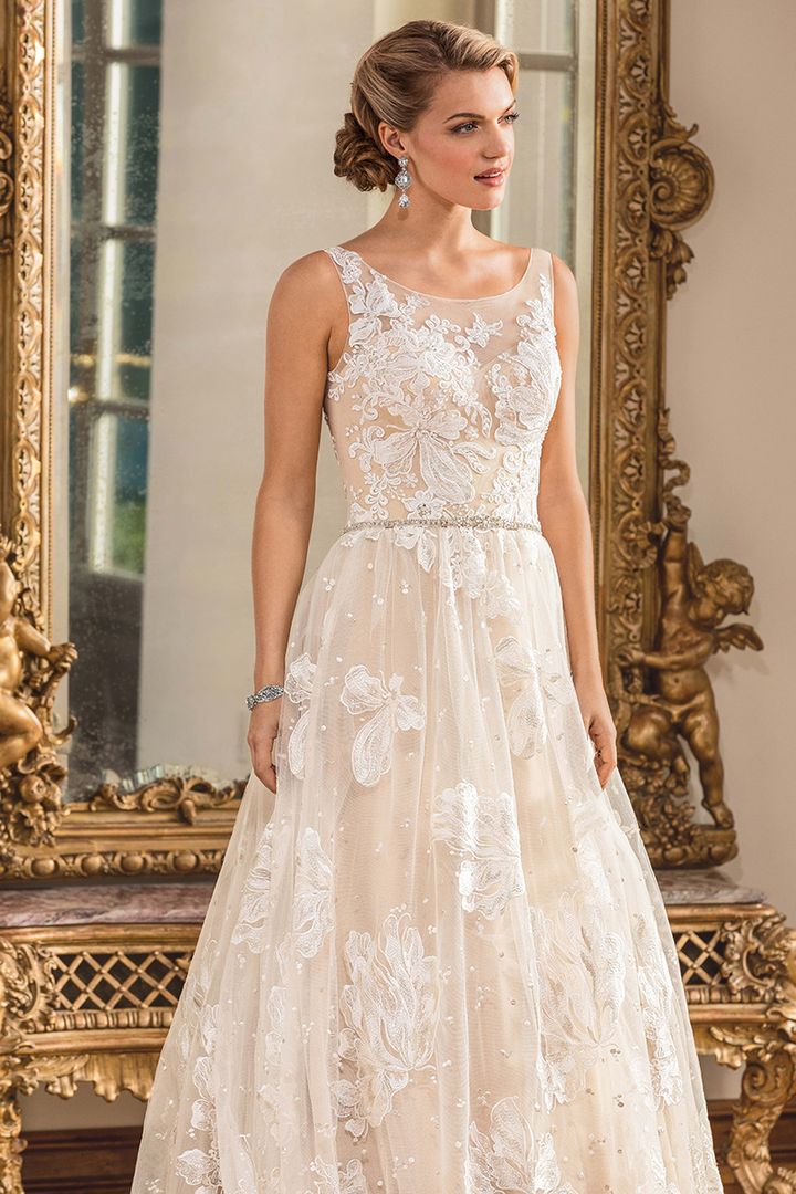 Gowns / Golden Hour Style 2350 Katiya Prev Next Gowns / Golden Hour Style 2350 Katiya Large lace Iris flowers dance between embroidered polka dots on the our distinctive Katiya gown, which is sleeveless, with a sheer bodice and illusion back. A jeweled belt encircles the natural waist for just the right touch of sparkle. From head to toe, this is a look for a bride unafraid of making a statement with her bridal fashion. Fabric: Large scale floral embroidered lace, tulle Available In: Light Nude/Ivory/Silver, White/White/Silver, Ivory/Ivory/Silver Shown In: Light Nude/Ivory/Silver Find a Store Share