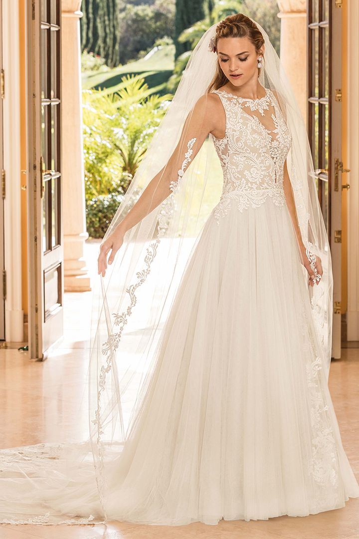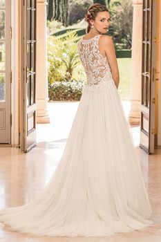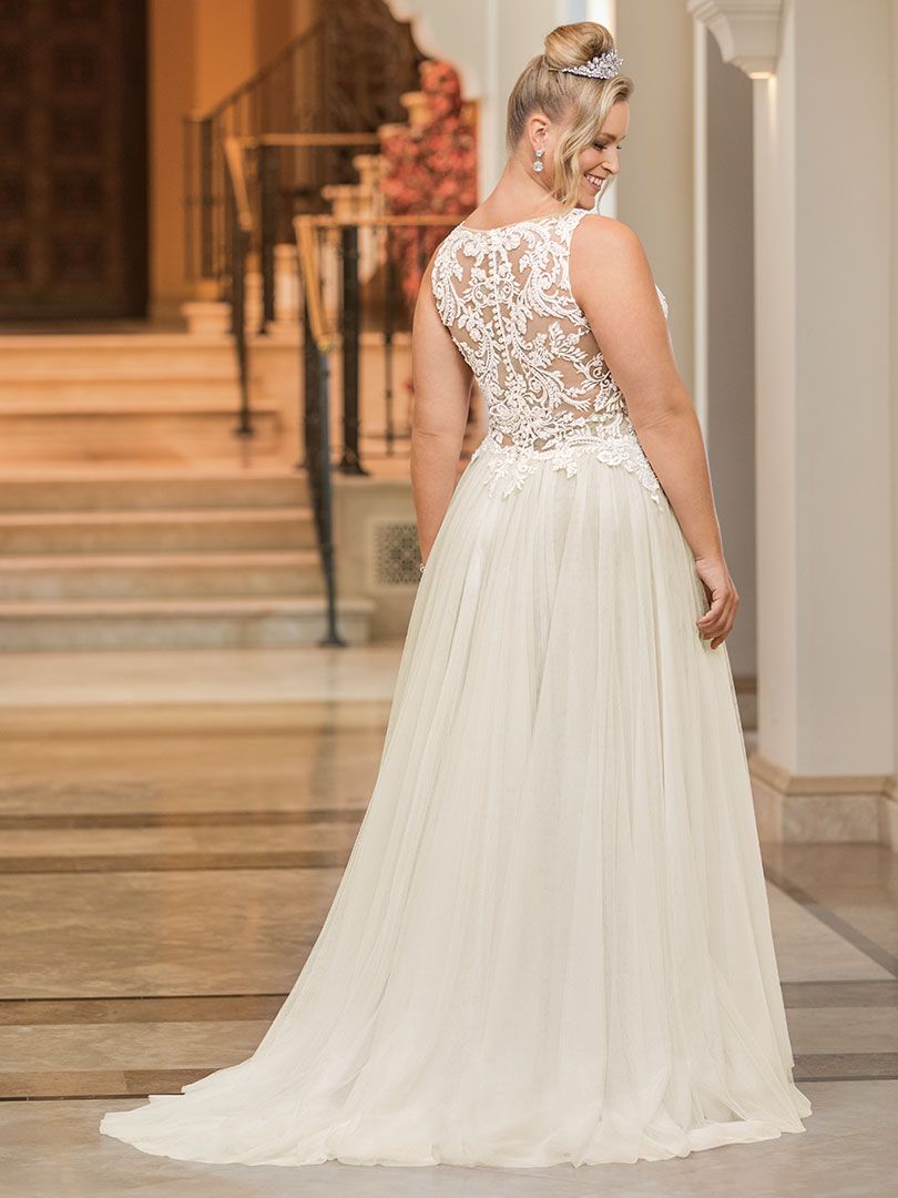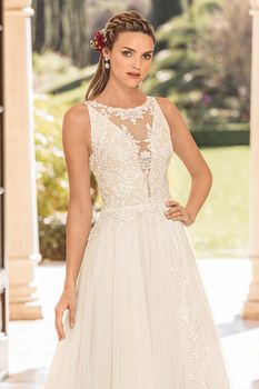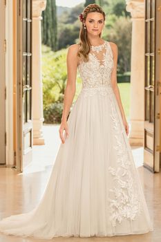 Gowns / Golden Hour Style 2351 Eloise Prev Next Gowns / Golden Hour Style 2351 Eloise Eloise is a slim A-line gown with an illusion jewel neckline featuring a plunging panel in the front. The stand out feature quite literally is an illusion slit that is uncovered across the side of the gown, creating a swirling length of floral lace to interrupt the soft tulle skirt. The sheer illusion lace back is finished off with a row of buttons. Fabric: Soft tulle, stretch chiffon Available In: Light Nude/Ivory/Silver, White/White/Silver, Ivory/Ivory/Silver Shown In: Light Nude/Ivory/Silver Find a Store Share