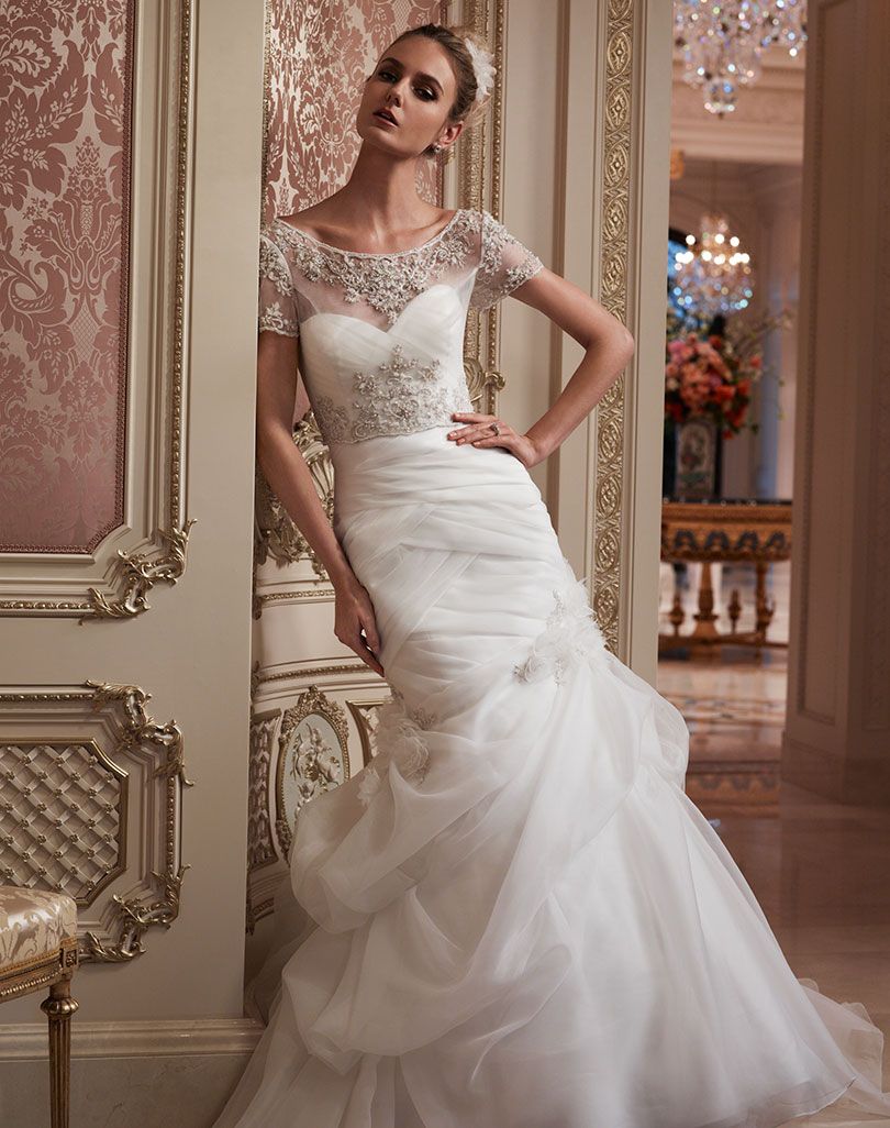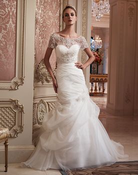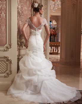 Gowns / Graceful Whispers Style 2088 Prev Next Gowns / Graceful Whispers Style 2088 This versatile gown can be worn with the detachable short sleeve deep “V” neck back jacket; or worn without for a strapless sweetheart look. The gown has a fitted pleated bodice that flows into layers of soft pick-ups with appliqués and flowers. Bodice is adorned with crystal buttons. Fabric: Iridescent Organza over satin, tulle jacket Available In: Ivory/Ivory/Silver, Champagne/Ivory/Silver, White/White/Silver Shown In: Ivory/Ivory/Silver Find a Store Share