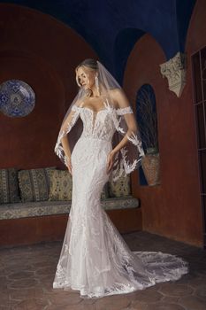 Get ready to turn heads with our sensational fit and flare wedding dress, Style 2554 Rochelle. This exquisite gown is designed to celebrate your curves and make you feel like a true goddess on your special day, radiating confidence and timeless beauty. Crafted with meticulous attention to detail, Rochelle combines the delicate allure of stretch chiffon with intricate lace embellished with beading and sequins. The off-the-shoulder straps of Rochelle add an element of romance and sophistication, beautifully framing your shoulders and neckline. With a 14-piece boning count, Rochelle ensures a flawless fit that hugs your curves in all the right places, accentuating your silhouette and providing support where you need it most. Prepare to make a grand entrance with the striking 78" train and complete the look with a matching fingertip veil.