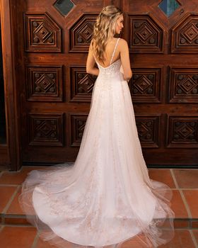 Gowns Style 2381 Demi Prev Next Gowns Style 2381 Demi Classic and feminine, Style 2381 Demi is a timelessly stunning wedding dress by Casablanca Bridal. Rose gold embroidery glistens atop vintage gold duchess satin, creating an eye catching multi-dimensional look. A flattering baby doll silhouette begins with a spaghetti strap sweetheart neckline and floats into a light, flowing tulle skirt. Fabric: Duchess Satin, Tulle, Rose Gold Embroidery and Silver Beading Available In: Vintage Gold/Ivory/Rose Gold/Silver, White/White/Silver, Champagne/Ivory/Silver, Ivory/Ivory/Silver Shown In: Vintage Gold/Ivory/Rose Gold/Silver Find a Store Share