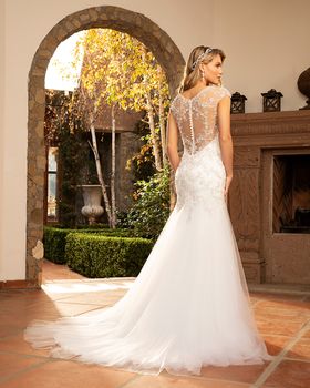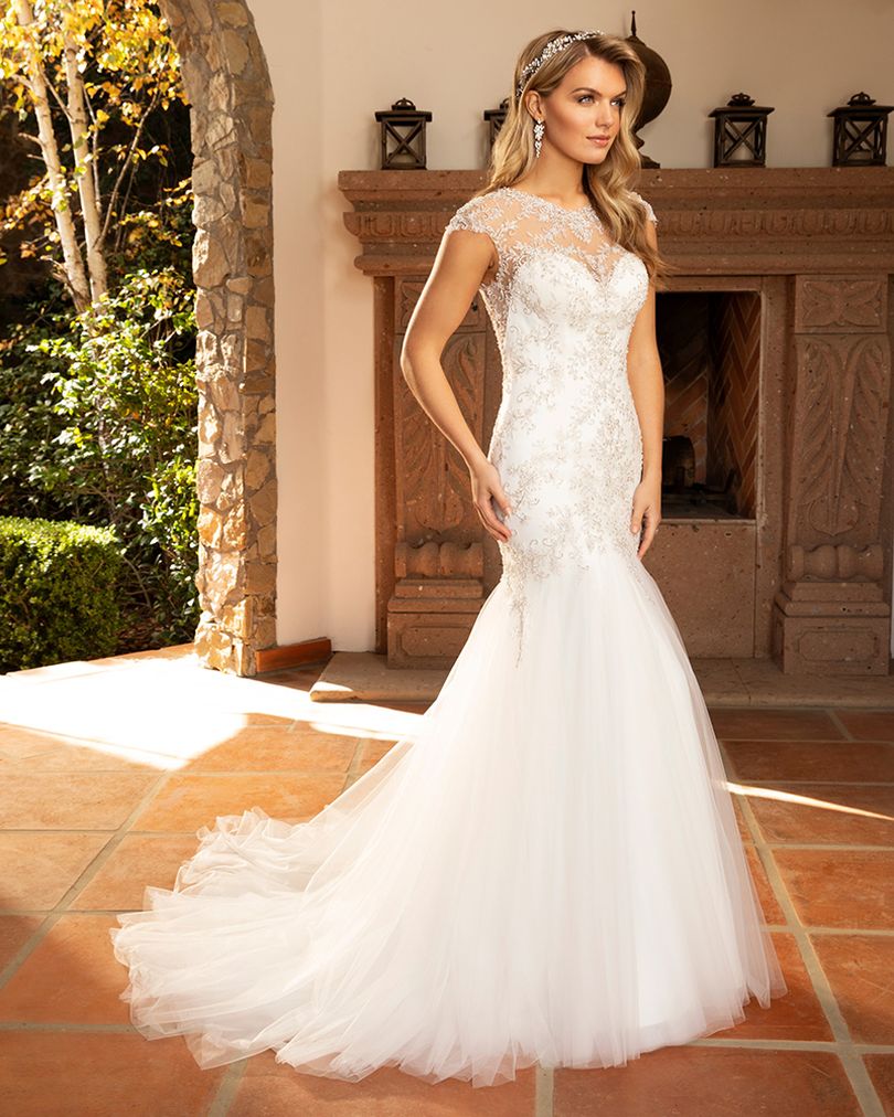 Gowns Style 2386 Monica Prev Next Gowns Style 2386 Monica Timeless beauty characterizes Style 2386 Monica by Casablanca Bridal. The illusion bateau neckline on this glimmering fit-and-flare wedding dress is decorated with extravagant beading that trails all along the bodice and illusion back. A row of sparkling buttons points toward the soft tulle skirt, floating ethereally beneath the bride as she walks. Silky charmeuse and perfecting satin guarantee both comfort and glamor. Fabric: Silky Charmeuse, Perfecting Satin, Tulle, Beading Available In: Champagne/Nude/Silver, White/White/Silver, Ivory/Nude/Silver Shown In: Ivory/Nude/Silver Find a Store Share