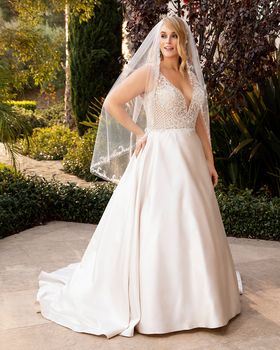 Gowns Style 2387 Lizzie Prev Next Gowns Style 2387 Lizzie Style 2387 Lizzie by Casablanca Bridal was made for the bride who won’t settle for any less than royalty! This A-line wedding dress is both simple and extravagant, the unique basketweave bodice decorated with stunningly intricate beading, beautifully contrasting the simple, yet impactful, duchess satin skirt with pockets! A matching veil ties the look together with an effortless flare. Available in plus size! Fabric: Duchess Satin, Basketweave Bodice with Silver Beading Available In: Champagne/Nude/Silver, White/White/Silver, Ivory/Nude/Silver, Vintage Gold/Nude/Silver Shown In: Vintage Gold/Nude/Silver Find a Store Share