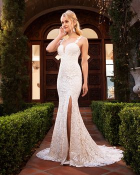 Gowns Style 2388 Raven Prev Next Gowns Style 2388 Raven Style 2388 Raven by Casablanca Bridal is a sensational bohemian bombshell! Subtly sparkling ivory lace dances along the fit-and-flare silhouette in bold patterns, traveling down the sweetheart neckline toward a picturesque train. A side slit on the skirt of this lace wedding dress offers a hint of sensuality, for the bride who’s not afraid to show a little leg. Fabric: Stretch Chiffon, Ivory Overlace Available In: Ivory/Ivory, Nude/Ivory, Ivory/Nude/Ivory, White/White Shown In: Ivory/Nude/Ivory Find a Store Share