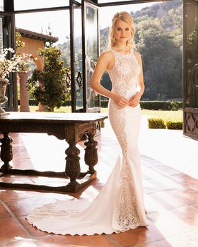 Gowns Style 2390 Shoshanna Prev Next Gowns Style 2390 Shoshanna Style 2390 Shoshanna is the definition of simple and sexy! This irresistible fit and flare wedding dress features a tank neckline adorned with beautifully beaded lace that trails all the way around the bodice and down the sides of this stunning gown. A row of buttons on the illusion back leads all the way down the stretch chiffon and satin skirt, stopping to bloom into a stunning train with a beautifully contrasting section of lace down the middle. Fabric: Stretch Chiffon, Satin, Ivory Beaded Lace Available In: Nude/Ivory/Nude/Ivory, Ivory/Ivory/Ivory/Ivory Shown In: Nude/Ivory/Nude/Ivory Find a Store Share