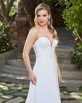 Simplicity has reached peak perfection with Style 2397 Krista by Casablanca Bridal, impactful and subtle all at once. Stretch Georgette on this A-line wedding dress promises all-day comfort, while delicate touches of lace trail all around the bottom of the skirt, blooming into a show-stopping 86” scalloped-edge train. The lace bodice features a strapless sweetheart neckline, lined in the front, with an illusion back to show a little skin. Perfect for a summer wedding, or any season in-between, you’ll be dreaming of this gown for years to come.
