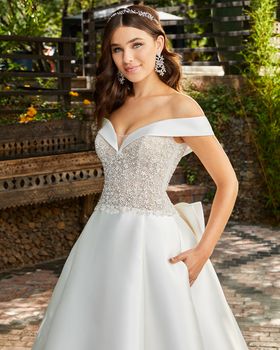 Designed to turn-heads and take your spouse-to-be’s breath away, Style 2401 Kensington by Casablanca Bridal comes in three different variations. The first variation, Style 2401-1, flaunts a flawless Mikado skirt with an 80” train, for a clean, sophisticated look. The extravagantly beaded bodice on this ballgown wedding dress catches the light at every angle, supported by off-shoulder Mikado sleeves that match the skirt. Last, but certainly not least, a detachable bow in the back takes center stage, tying the look together with a classic, statement-making impact.