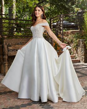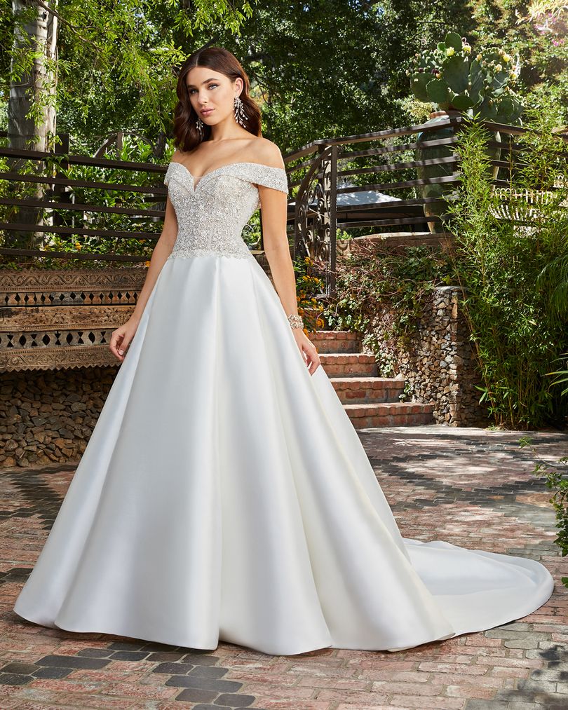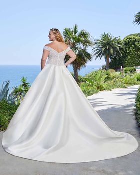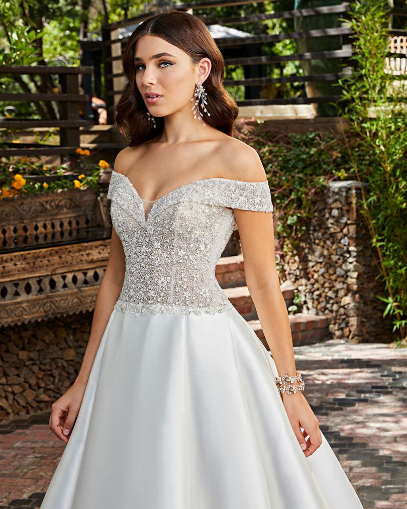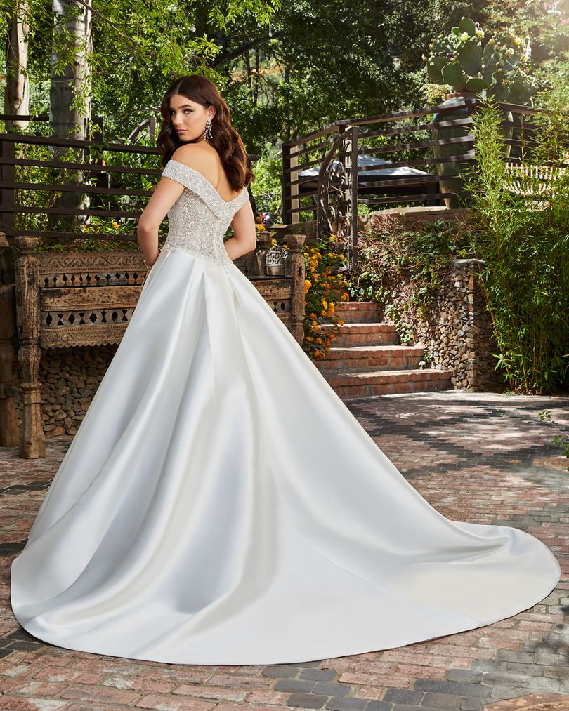 Designed for the princess bride with a touch of whimsy, Style 2401 Kensington by Casablanca Bridal comes in three different variations. Here to steal the show is Style 2401-3, featuring an all-Mikado skirt with an 80” train and a chic finger-bow attached, so you can hold your skirt up while you twirl! Decadent silver beading decorates the entire bodice on this ballgown wedding dress, trailing effortlessly along the off-shoulder sleeves. Available in plus size!
