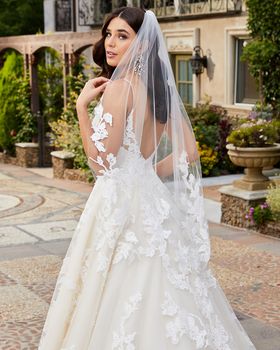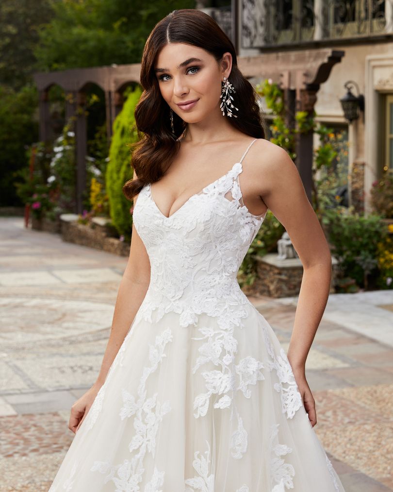 Alluring Style 2409 Emery by Casablanca Bridal is the ideal simple, romantic wedding dress. For the bride whose motto is “less is more,” this ballgown is bound to please. Simple floral overlace blooms from head to toe, trailing all the way down the organza skirt with a 70” train and ending in horsehair edging. The bodice, fully lined, features a classic V-neckline held up delicately by spaghetti straps. A knee length veil flaunts matching, large floral lace appliques, adding a beautiful finishing touch.