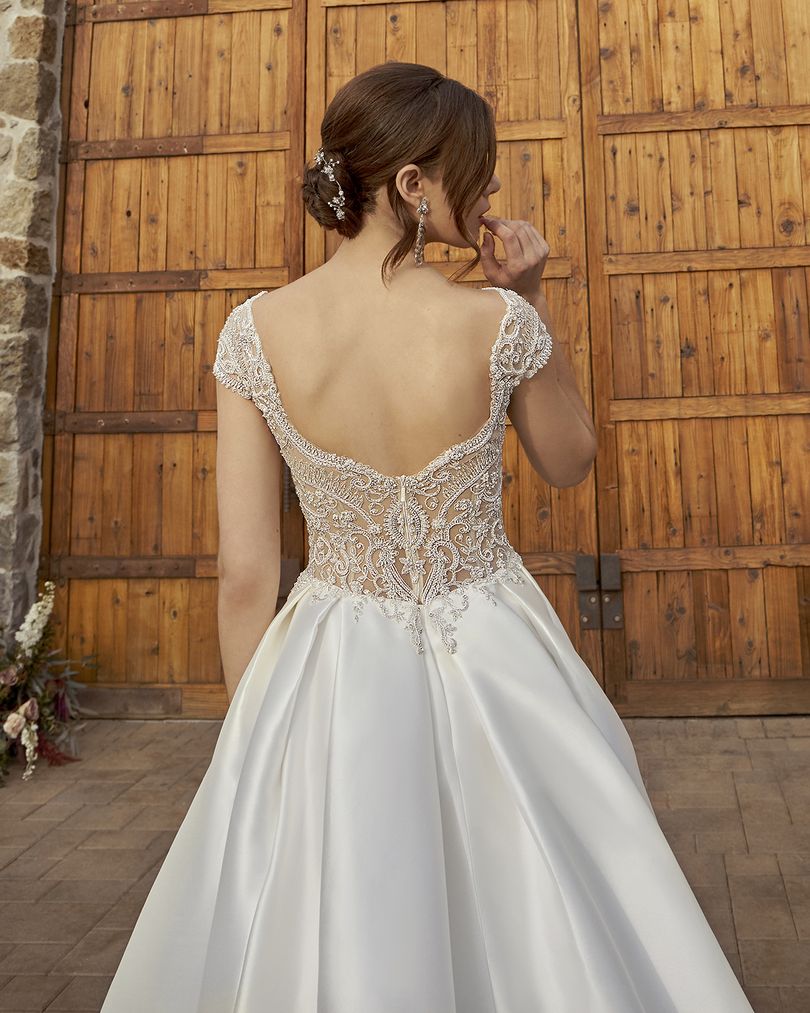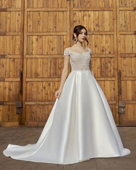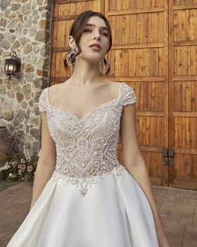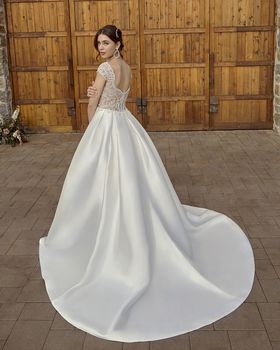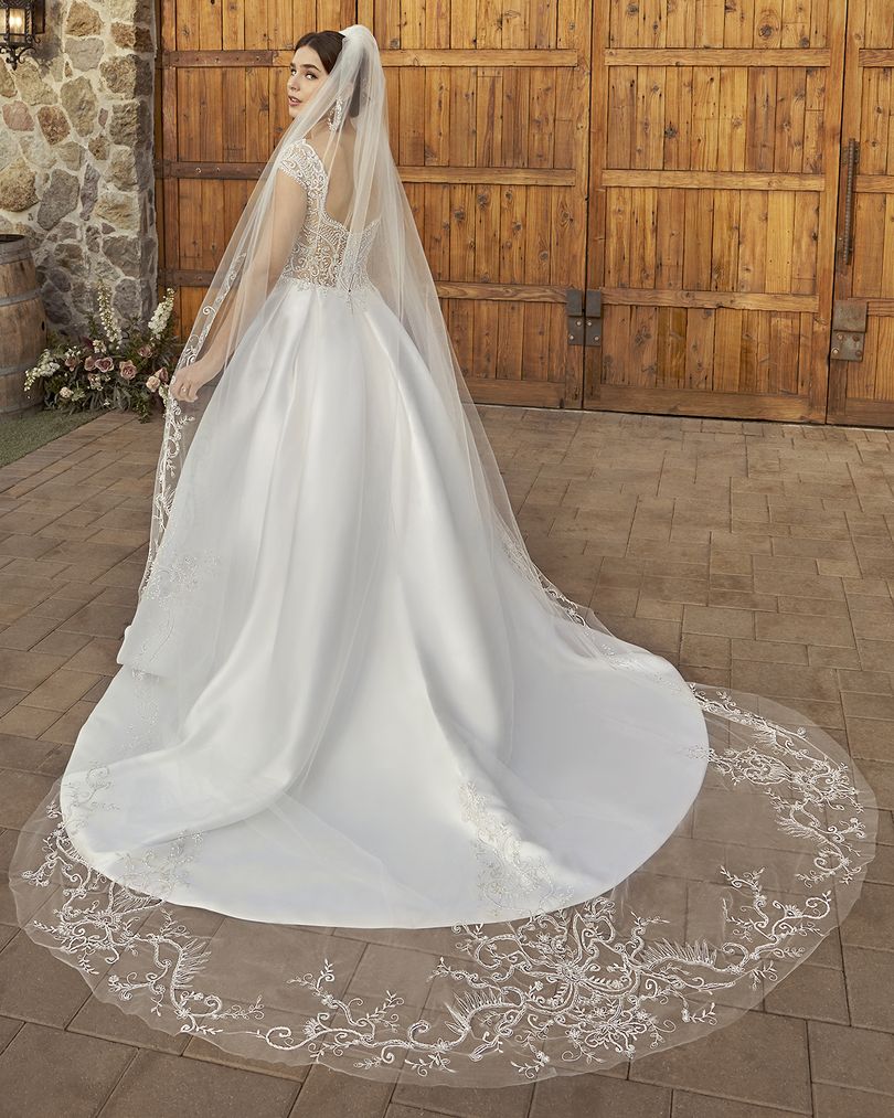 Simple and elegant Style 2416-1 London by Casablanca Bridal is bound to have every head turning. The A-line silhouette on this timelessly royal wedding dress flawlessly accentuates the natural shape of the body, while a sweetheart neckline and cap sleeves complement the intricately beaded, sheer bodice. The dramatic, yet simple skirt with a 69” train is available both in Mikado and satin. Pair London with her 125” cathedral length matching veil, sold separately, and your unforgettable wedding day look is complete.