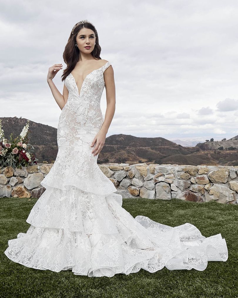 Feminine and flirtatious Style 2417 Ellie is decorated with the most charming floral lace, blooming all over the design from head to toe. This romantic wedding dress by Casablanca Bridal features a remarkable figure-hugging mermaid silhouette, cascading beautifully into a playful layered skirt with horsehair trim and a 75” train. A modest back complements the striking low plunge V-neckline, which transitions into off-shoulder sleeves for a sophisticated touch of seduction.