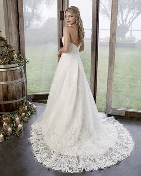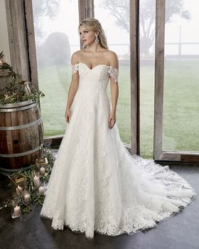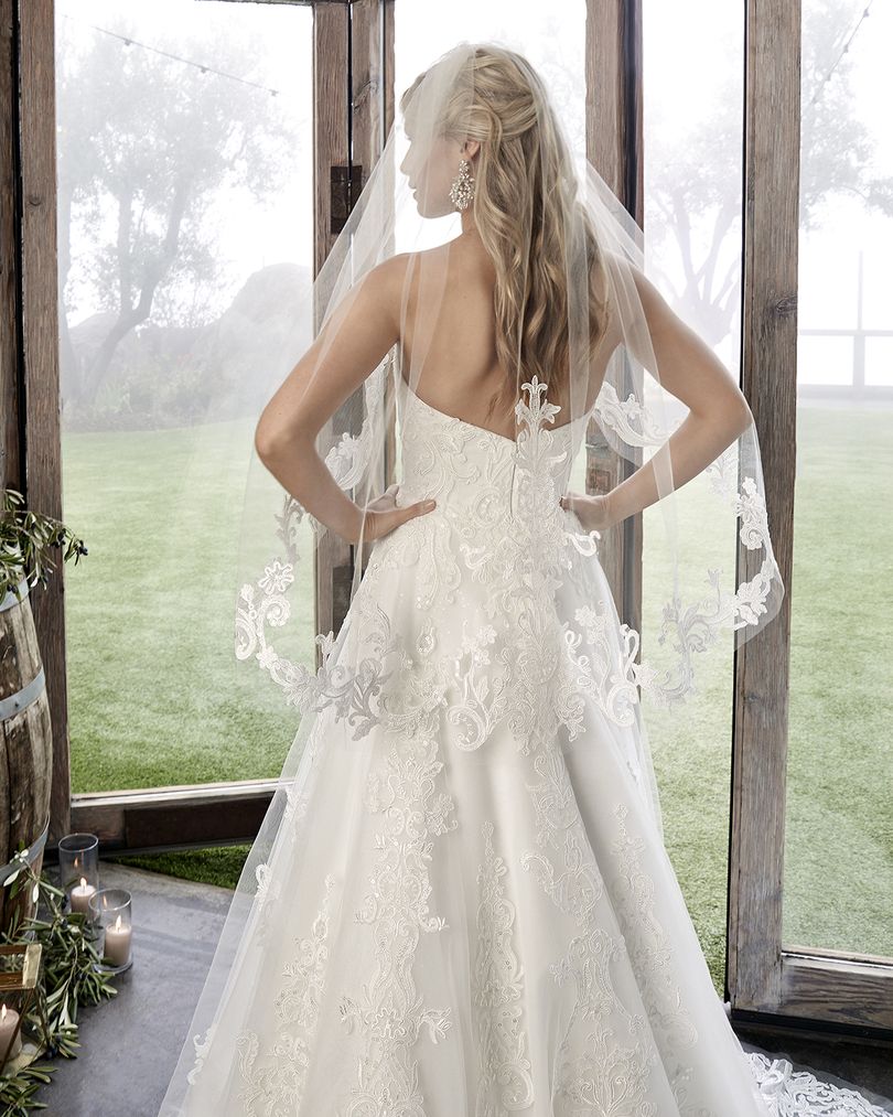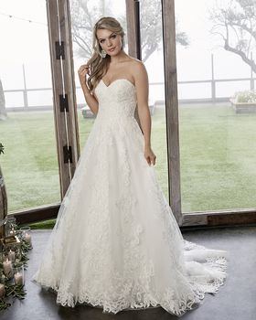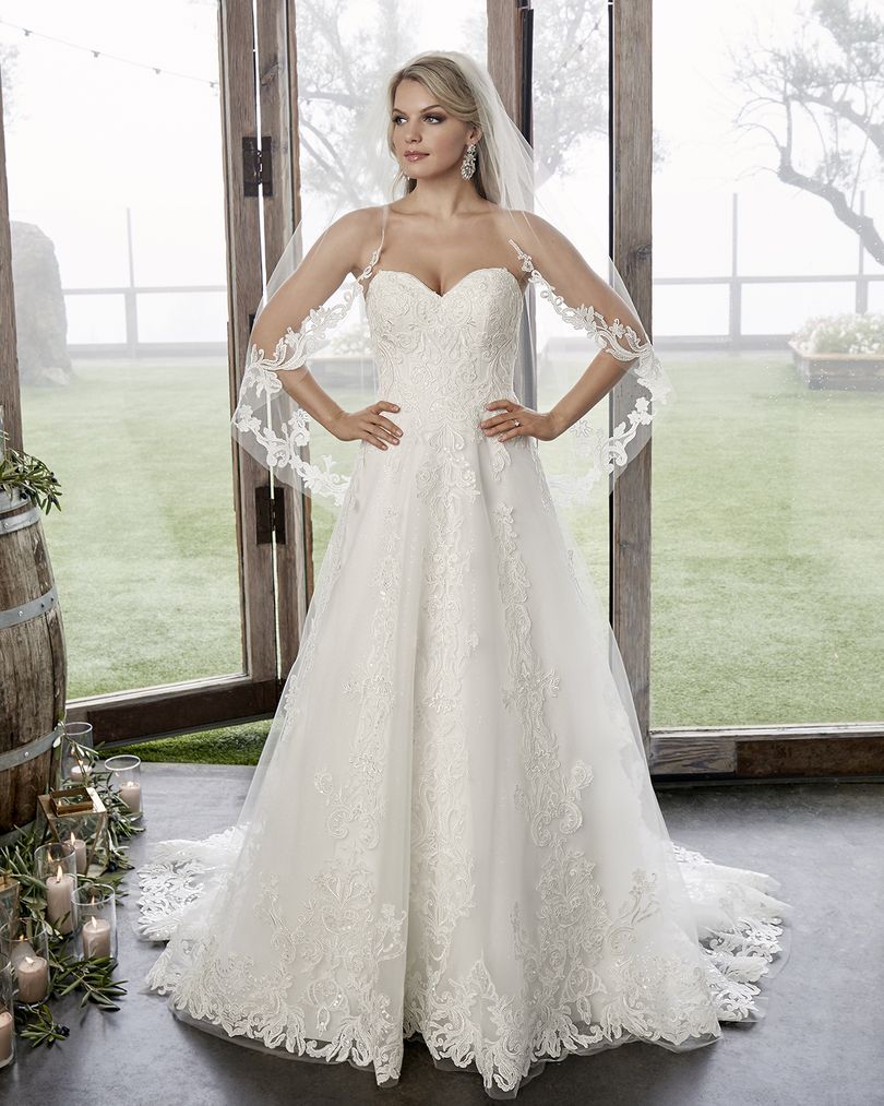 Style 2418 Caroline dazzles in the subtlest of ways. This A-line, simple wedding dress by Casablanca Bridal features two looks in one, with the option for removable off-shoulder lace sleeves to add a touch of whimsy to the originally strapless sweetheart neckline. Sequined tulle sits underneath swirling lace appliques, for the perfect amount of subtle sparkle and irresistible detail on this simple design. A matching 40” fingertip veil with lace detail, sold separately, ties the look together beautifully. Available in plus size.