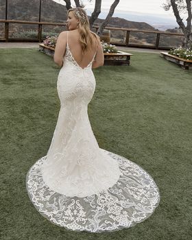 Bursting with dimensional detail, Style 2424 Brooklyn by Casablanca Bridal is the perfect lace wedding dress, featuring a beautifully subdued sparkle. The most sensational embroidered and sequined lace dances atop comfortable stretch georgette, adding a subtly impactful element of luxurious glimmer. Classic spaghetti straps frame the V-neckline, flowing flawlessly into a complementary low-V back with slight sheer panels, while a 74” sheer lace train trails behind effortlessly. Available in plus size.