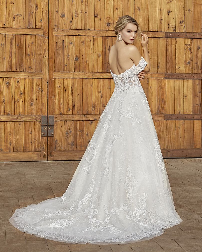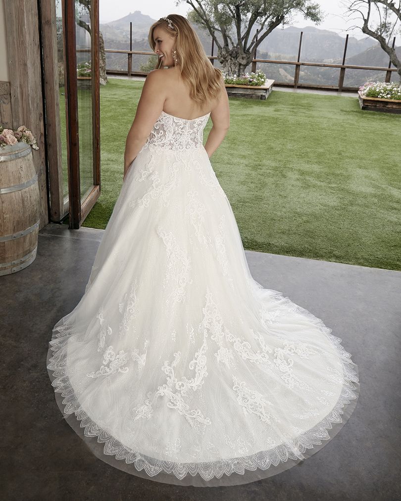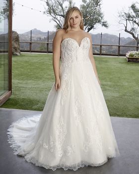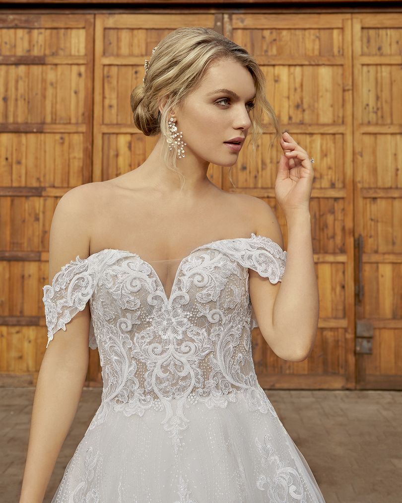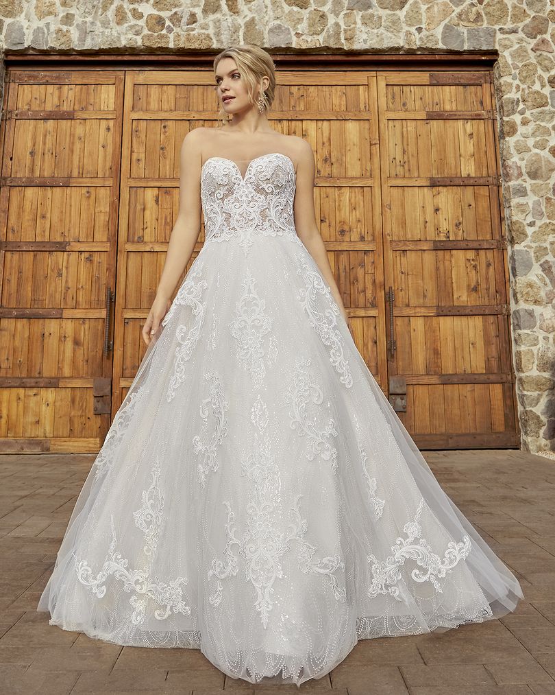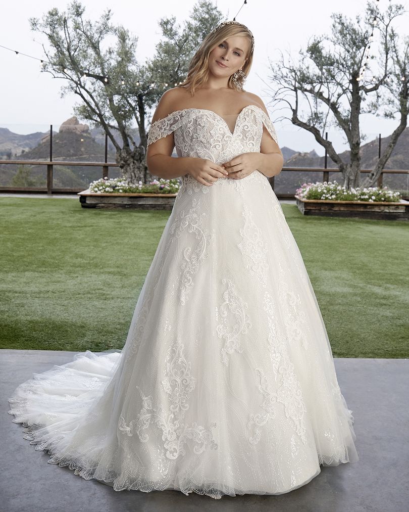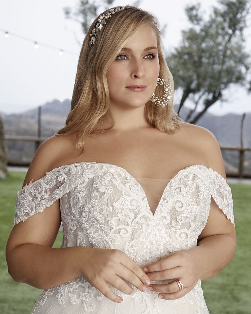 This one-of-a-kind A-line lace wedding dress by Casablanca Bridal is bound to make you feel like a modern princess bride. Style 2427 Myla’s sheer bodice is decorated with beautiful swirling lace patterns trailing along the removable off-shoulder sleeves, which can be taken off for a classic strapless sweetheart look during the reception. A layer of sequined tulle underneath ensures a sophisticated sparkle, glittering all throughout the voluminous 74” train. Available in plus size.
