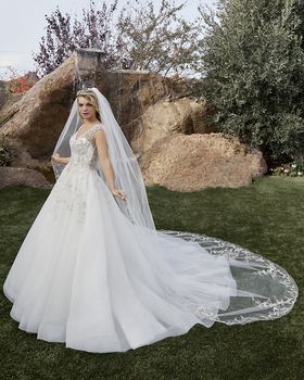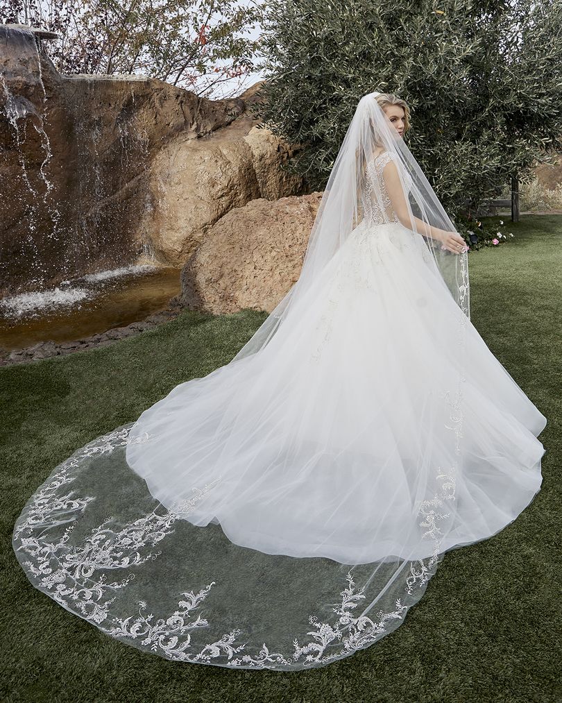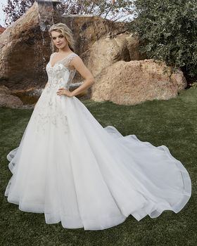 This princess A-line wedding dress by Casablanca Bridal is the perfect mix of classic and contemporary. Style 2434 Johanna is lined with the most comfortable satin, for a soft and flowy feel. The detailed bodice is held up by thick tank straps and covered in the most glamorous beading which decorates the entire V-neckline and sheer back, trailing slightly down the front and back of the skirt. A 72” tulle train is dramatic and ethereal, floating behind effortlessly, while a matching 125” cathedral length veil adds even more drama to this timeless look. Available in plus size.