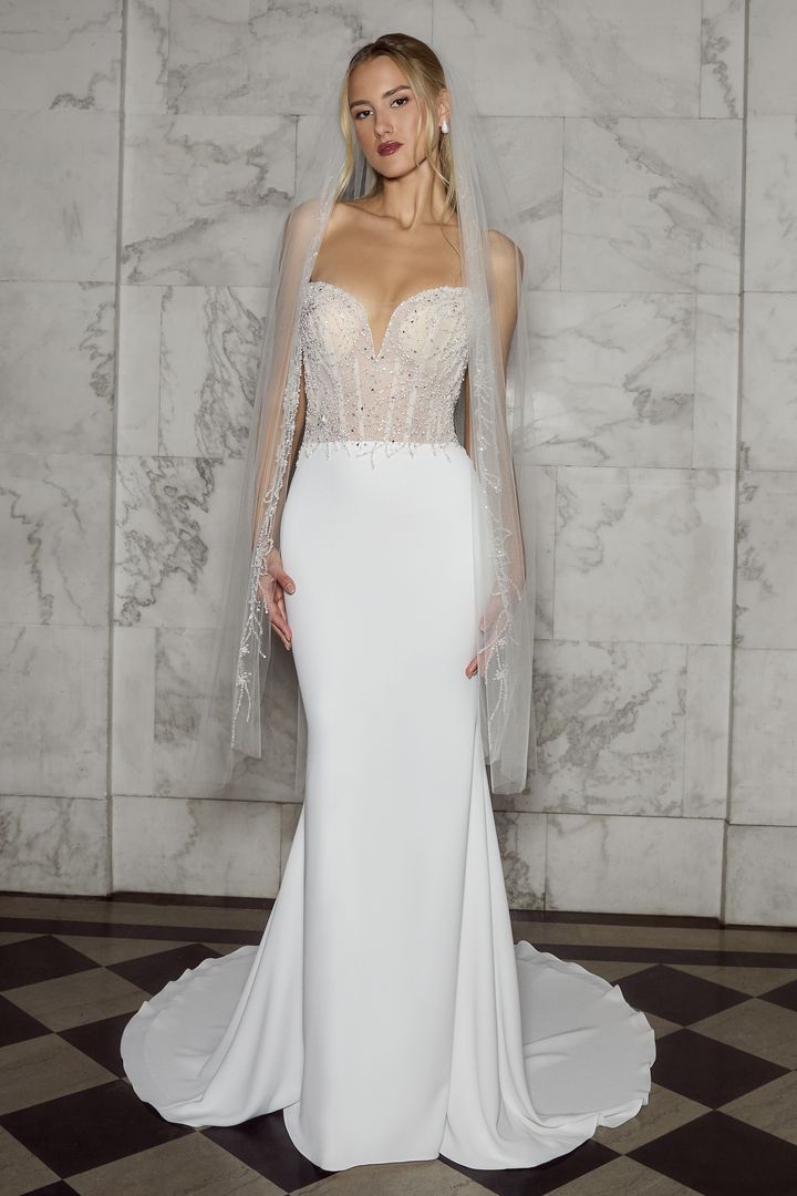 Style 2584-3 Celestia is the sister gown of 2584-1 and 2584-2 featuring a skirt with no slit. Crafted from luxurious stretch georgette and shimmer tulle, this fit-and-flare gown is designed to accentuate every curve. The bodice is embroidered with Casablanca Bridal's signature beadwork, creating a tantalizing display of intricate artistry. Her plunging pointed sweetheart neckline and exposed 18-point boning are flirtatious and eye-catching. In the back, her 67-inch train is simply alluring. Pair with her matching waltz veil, 2584V, offered separately.