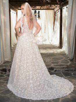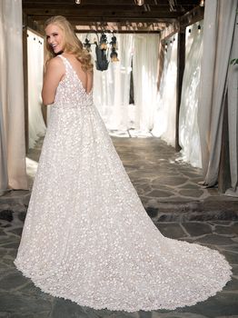 Gowns / Hillside Fairytale Style 2354 Liliana Prev Next Gowns / Hillside Fairytale Style 2354 Liliana Far-away fantasies come to life in the form of this other-worldly fairy tale lace wedding dress by Casablanca Bridal! Organza and sequined tulle set the stage for Liliana’s stunningly bold floral lace pattern, which dances down her plunging neckline, accentuated by a beaded belt at the natural waist. A matching veil and optional front lining provide options for changing up this magical look. Fabric: Organza, Sequined Tulle, Laser Cut Floral Lace Available In: Light Champagne/Ivory/Silver, Ivory/Ivory/Silver, White/White/Silver Shown In: Light Champagne/Ivory/Silver Find a Store Share