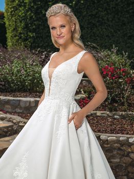 Gowns / Hillside Fairytale Style 2372 Vivian Prev Next Gowns / Hillside Fairytale Style 2372 Vivian Vivacious Vivian makes a grand entrance wherever she goes! This stunning ballgown wedding dress by Casablanca Bridal is both simple and extravagant, made entirely of the most exquisite duchess satin. Sequined Chantilly lace adds emphasis and subtle shimmer to the V-neckline on the bodice and straps, cascading down her dramatic cathedral length train. Fabric: Duchess Satin, Chantilly Lace with Sequins Available In: Champagne/Nude/Ivory, White/White, Vintage Gold/Nude/Ivory, Ivory/Nude/Ivory Shown In: Vintage Gold/Nude/Ivory Find a Store Share
