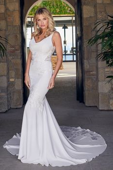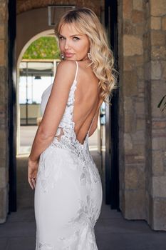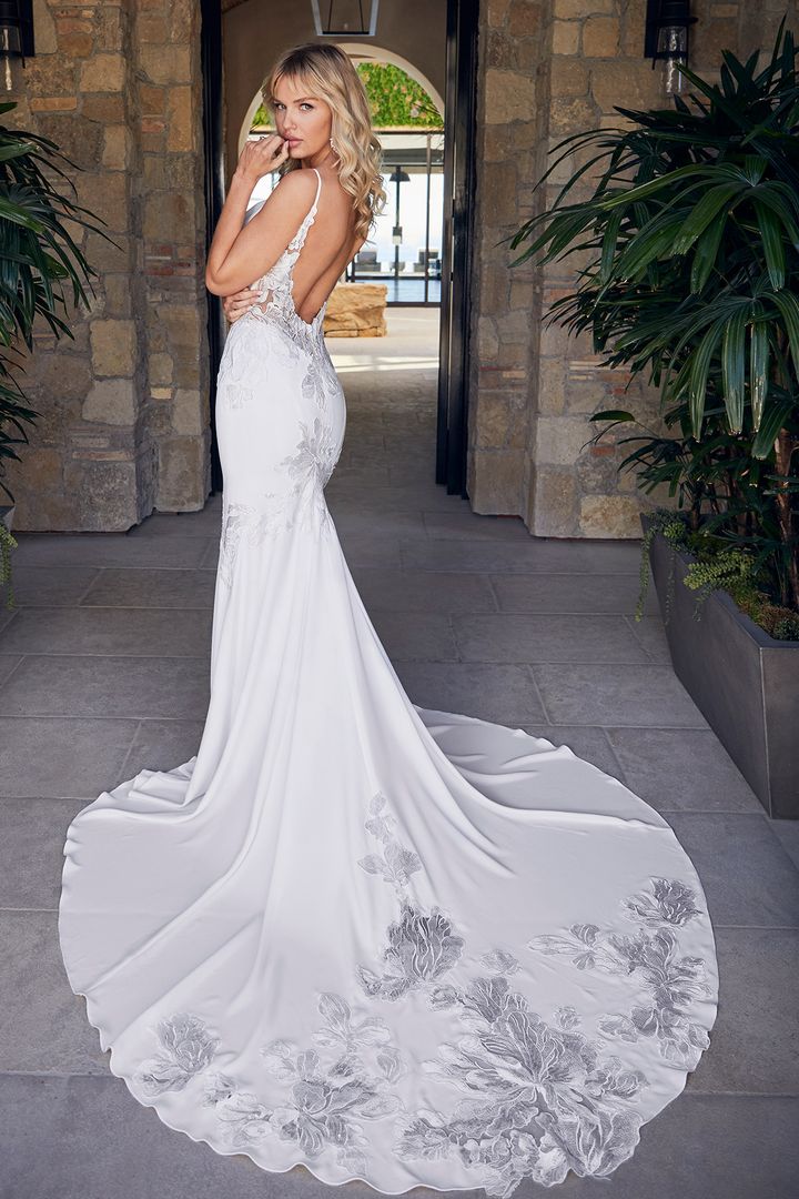 Say hello to bewitching LE102 Lilou, the epitome of refined-casual style. Modern brides, get ready to make your mark in this unforgettable wedding dress. Simple stretch chiffon spreads along the fit-and-flare silhouette for a sensual feel and comfortable all-day wear. Romantic floral lace blooms in sections around this clean design, emphasizing the natural waist, bust and hips with effortless flare. Spaghetti straps support the unique draped neckline, transitioning into a low V-back and epic 77 inch train for a picturesque moment with your spouse-to-be.