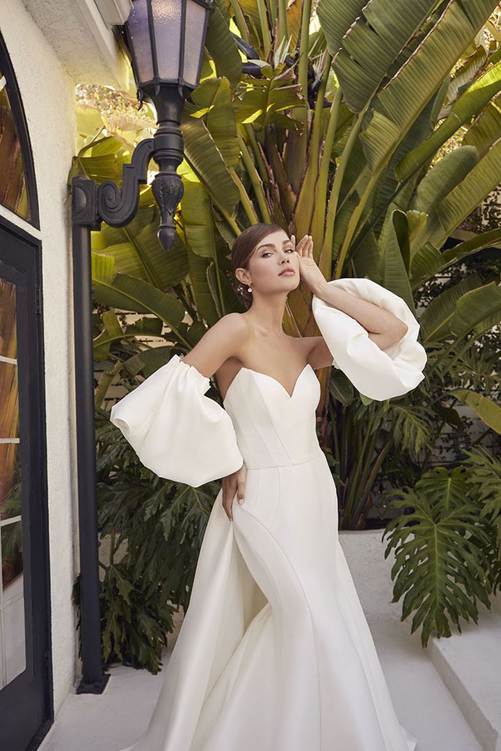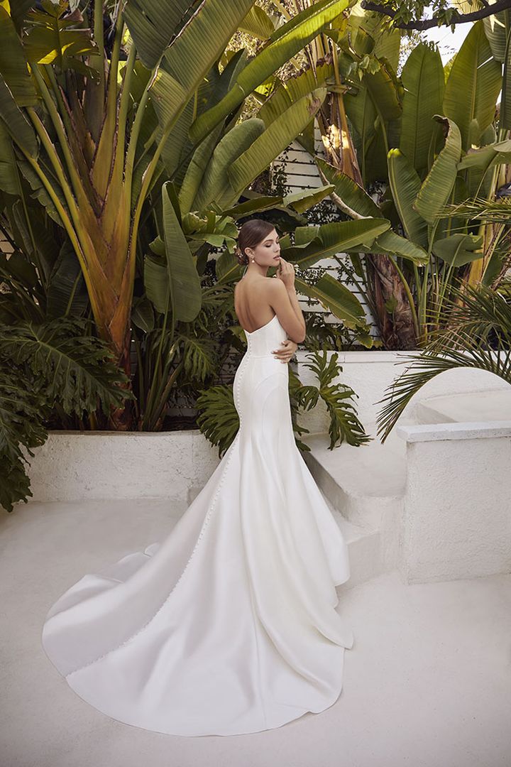 She is glamour, she is grace, she is Gianna. Style LE115 Gianna by Le Blanc is a contemporary masterpiece cut from stretch Mikado, impeccably tailored for the fashion-forward bride inviting versatility to her wedding. An architectural sweetheart neckline sculpts the bust of this fit and flare silhouette that exudes modern sophistication, while a lust worthy 74" train draws the gaze of everyone in the room.