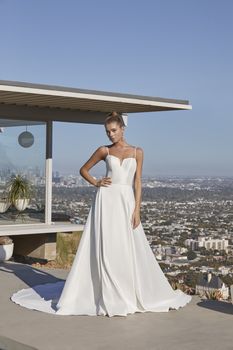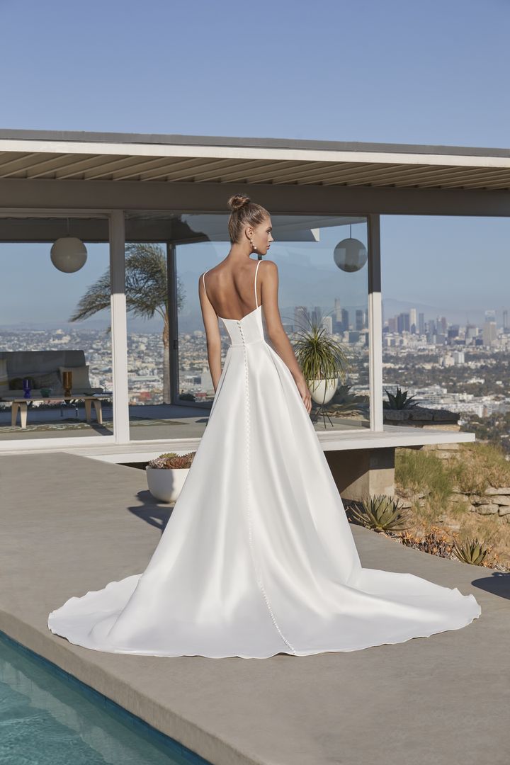 Le Blanc Style LE125 Tobie Prev Next Le Blanc Style LE125 Tobie Paint a picture of everlasting romance in Style LE125 Tobie by LeBlanc, a masterpiece of stretch mikado unfolding in a figure-flattering fit and flare silhouette that hugs your every curve. A subtle v-neckline and whisper-thin spaghetti straps add understated elegance, while a a trail of buttons cascade from mid back to 71" train Available In: Ivory Shown In: Ivory Find a Store Share