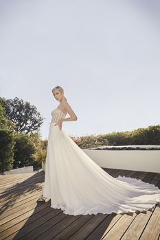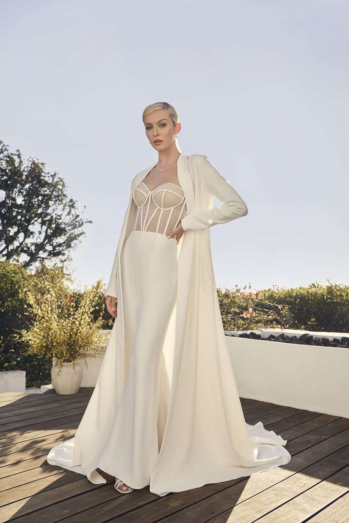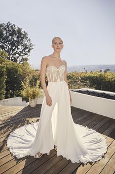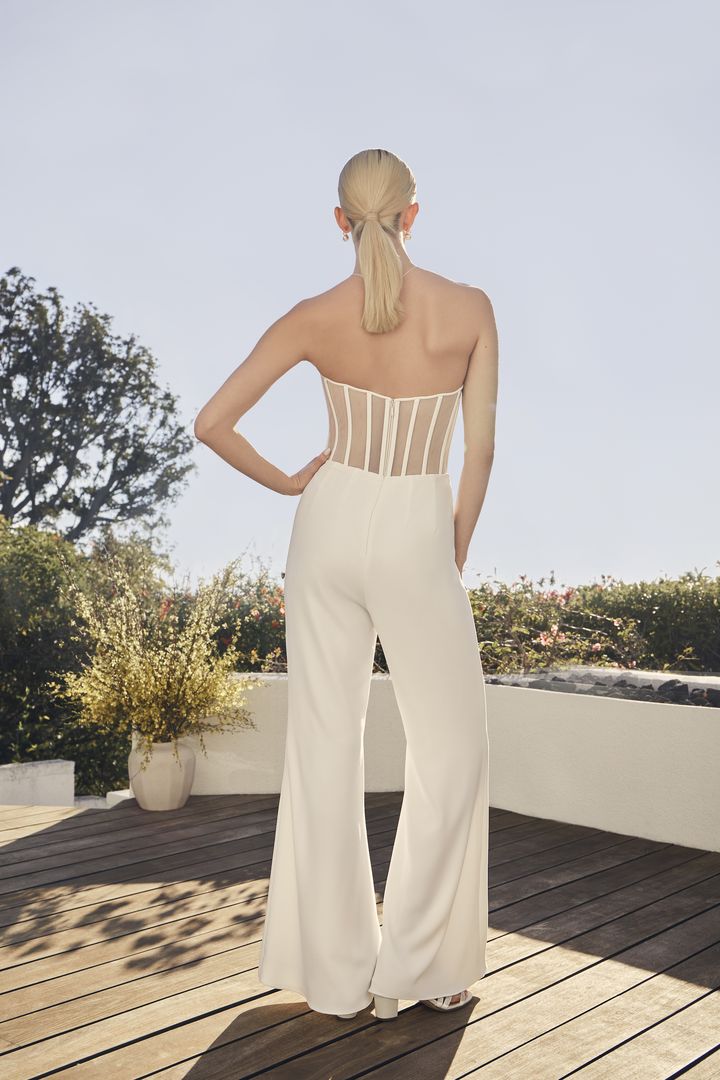 Make a dramatic entrance as you walk wearing LE133 Serene, our stretch chiffon jumpsuit. The sheer bodice and sweetheart neckline frame the bust with ample boning. While continuing down, her attached pants featuring wide palazzo pants that flow effortlessly in the wind. Pair this versatile pantsuit with the matching jacket (LE133JKT) or chiffon skirt (LE133SK), both sold separately.