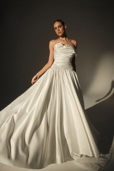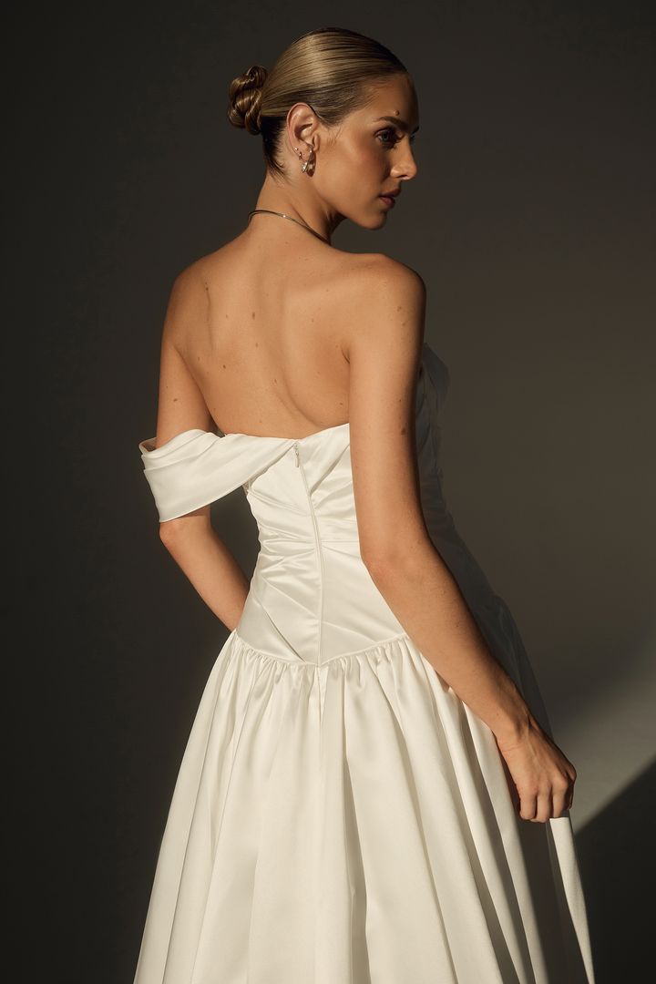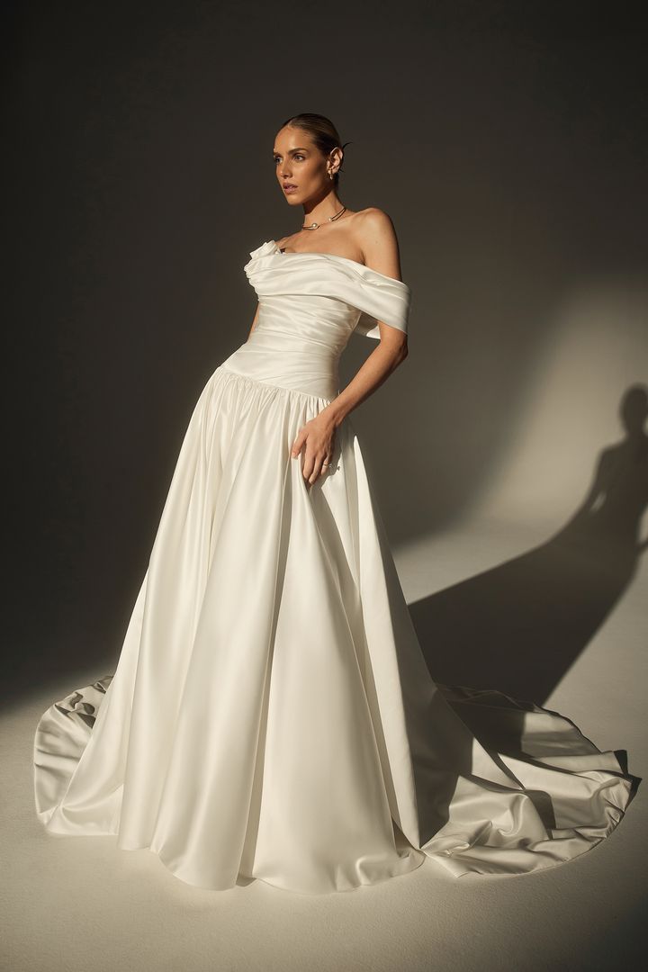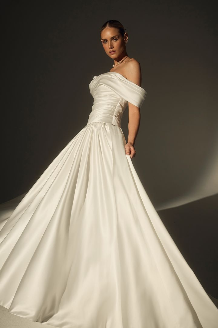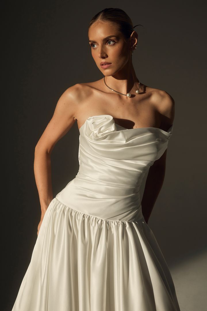 Introducing LE171-1, a sculptural satin masterpiece made for the modern bride. Crafted from luxurious sateen satin, this one-shoulder A-line gown features couture ruching throughout the bodice and a striking 3D rose detail placed delicately at the neckline. The cathedral-length train adds romance to its modern edge, while asymmetrical lines and crisp draping elevate the look to editorial heights. Sophisticated yet soft, LE171-1 is a timeless gown designed to make an unforgettable statement, especially when paired with matching satin gloves or a cathedral veil for a fully styled bridal moment.