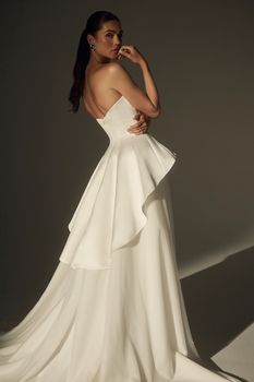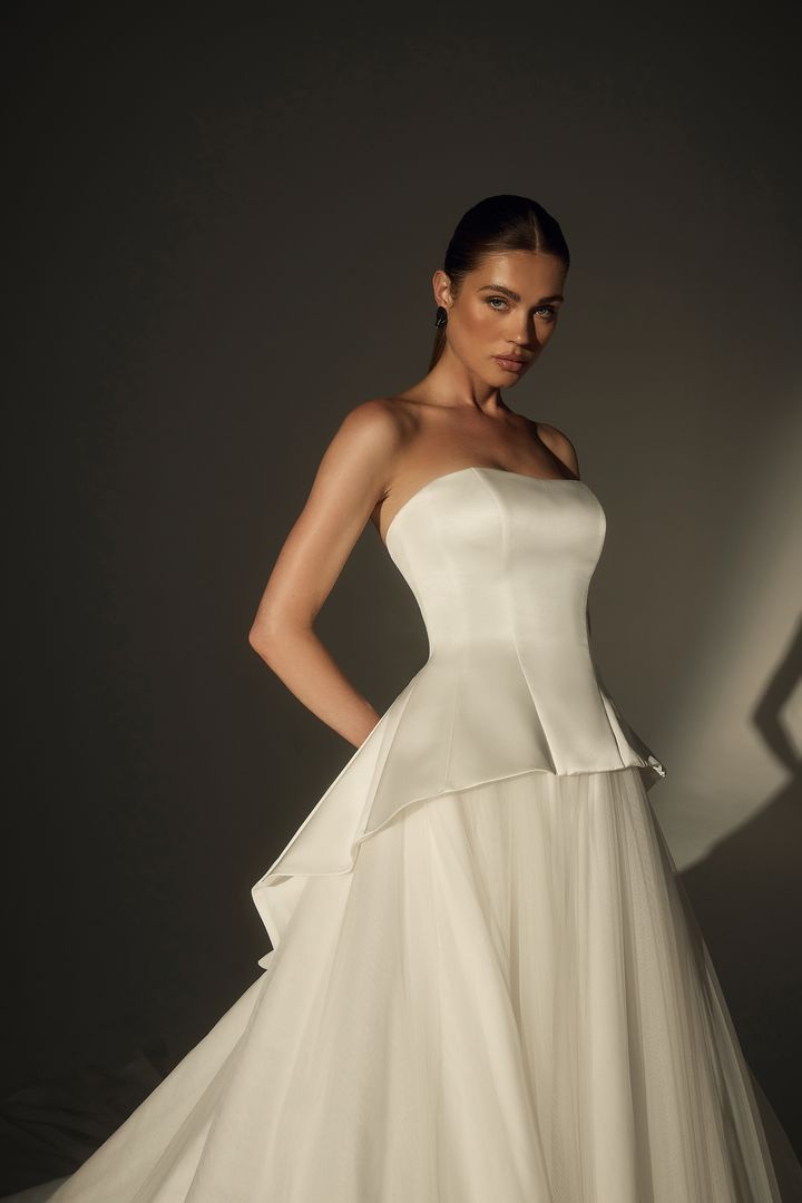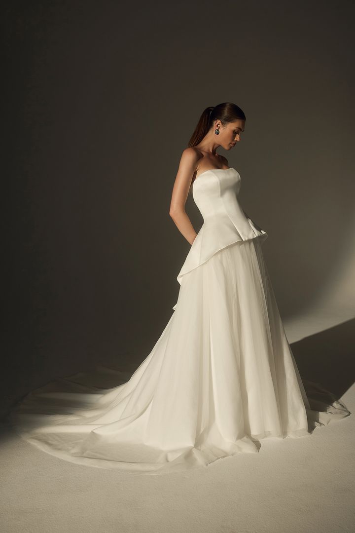 Own the aisle in LE174 Josiane, a two-piece bridal look that fuses couture edge with timeless elegance. The strapless bodice features a modified sweetheart neckline and sculptural contouring seams, creating a clean, flattering silhouette. At the back, a dramatic tuxedo-inspired peplum adds architectural intrigue, while a detachable silk tulle skirt softens the look with airy movement, offering a striking contrast to the structured top. Finished with a sweeping 109-inch royal cathedral train, this dynamic design is made for the fashion-forward bride who values versatility, artistry, and unforgettable presence.