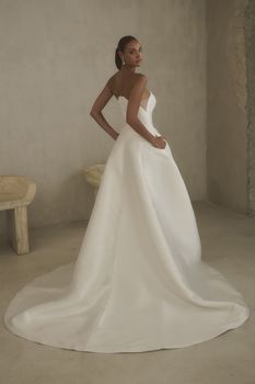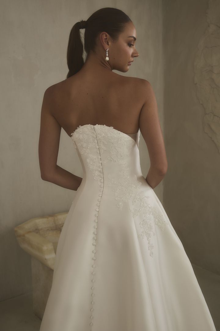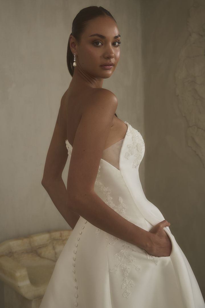 2624-1 Hadley captures the quiet glow just after sunset—when the world feels still, yet alive with possibility. The strapless arched neckline, mirrored in front and back, frames the A-line silhouette, its clean shape softened by delicate floral sequin lace that glimmers like fading daylight. Illusion side seam cutouts add a breath of modern intrigue, while the Mikado skirt moves with quiet strength, pooling into a chapel train. Hidden pockets lend a touch of ease, perfect for a bride who embraces both elegance and freedom. Let Hadley’s luminous Mikado and subtle sparkle take center stage with minimal jewelry and the soft frame of a fingertip veil. For a modern twist, pair with a sleek ponytail or low chignon to echo the gown’s architectural elegance.