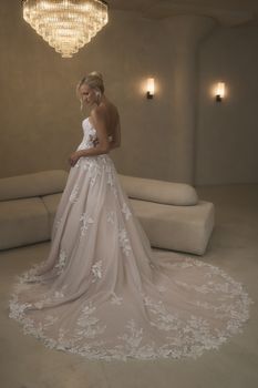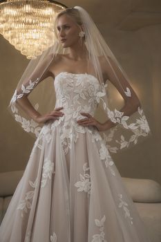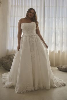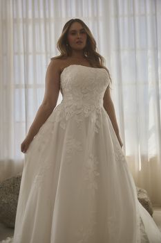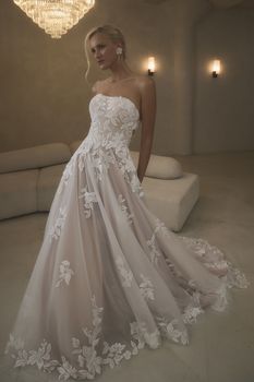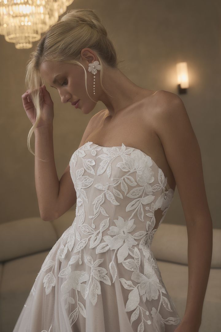 2627 Elsbeth feels like a garden in motion, where every step sends blossoms drifting across a soft breeze. This strapless A-line gown blooms with dimensional floral sequin lace appliqués that climb over the bodice before cascading in gentle trails down the skirt and into a breathtaking train—its lace-edged sweep a true statement of romance. Layers of airy tulle and smooth lining create an ethereal lightness, allowing the gown to move with fluid grace. For added allure, the SL061 Elsbeth sleeves—detachable, off-the-shoulder draped tulle—frame the neckline with effortless softness, perfect for a ceremony entrance as timeless as twilight. Pair with the matching fingertip veil, sold separately, to echo the floral lace and highlight the gown’s sweeping train. Wear the detachable sleeves for a romantic ceremony look, then remove them for an airy, free-spirited reception style.