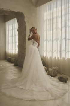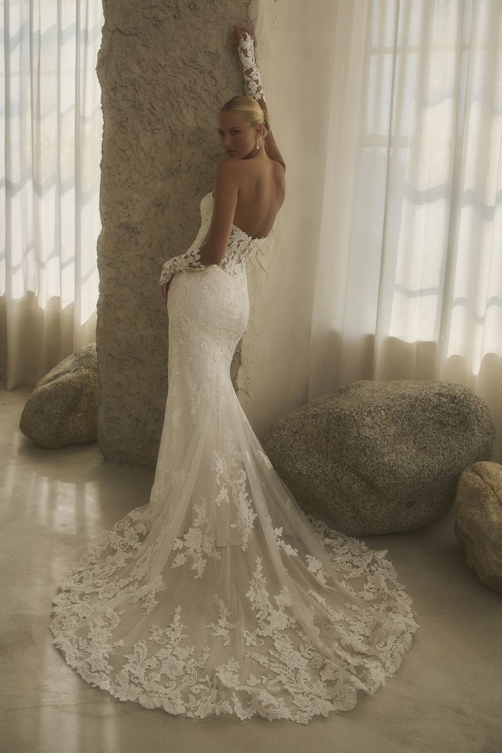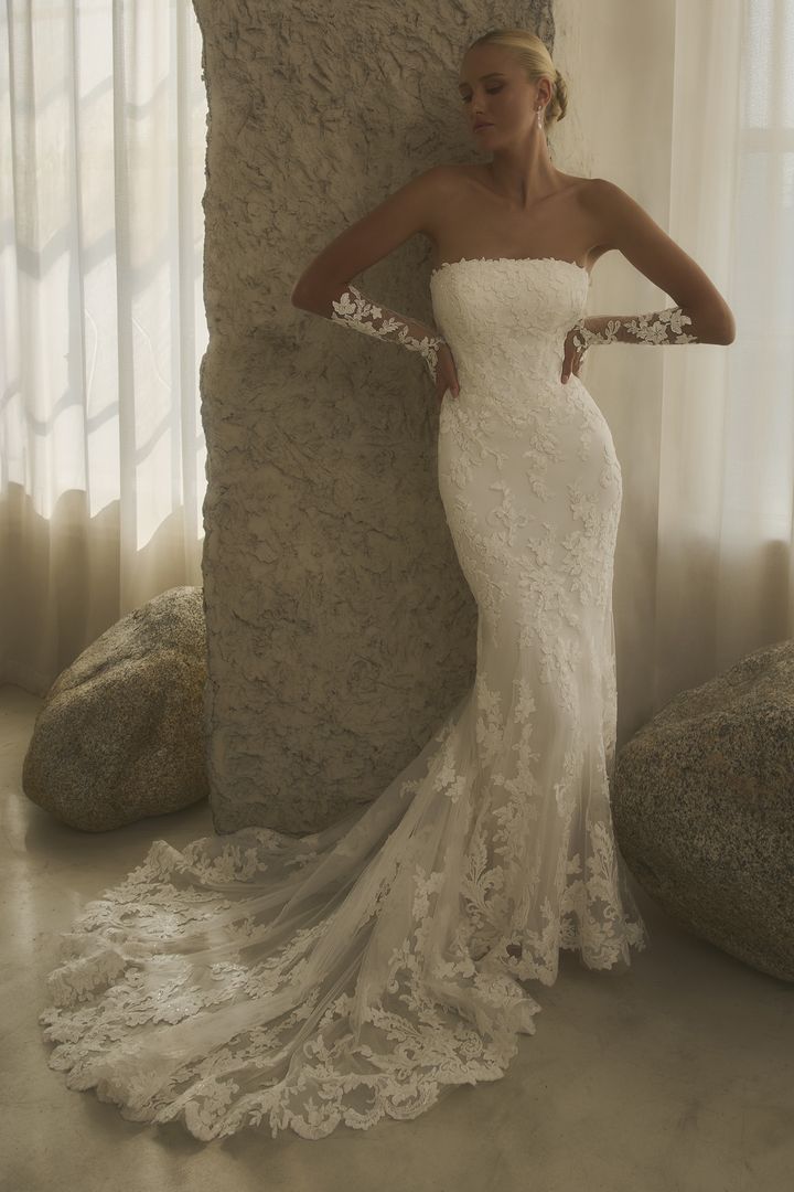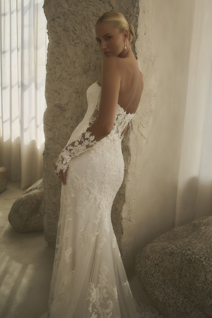 2630-1 Maxine is the embodiment of sleek romance, sculpted to follow every curve with fluid precision. The strapless, straight-across neckline offers a clean, modern edge, while floral sequin lace appliqués bloom across the fitted bodice and trail delicately down the fit-and-flare skirt. The unlined back bodice mirrors the removable SL062 Maxine sleeves—forearm-length tulle adorned with matching lace and finished with a graceful finger loop—creating a seamless harmony between structure and softness. For a dramatic transformation, the detachable A-line overskirt with envelops the gown in sweeping tulle and lace, perfect for a ceremony entrance rich with movement and dimension. Wear with the SL062 sleeves and detachable overskirt for a regal ceremony look, then reveal the sleek fit-and-flare silhouette for the reception.