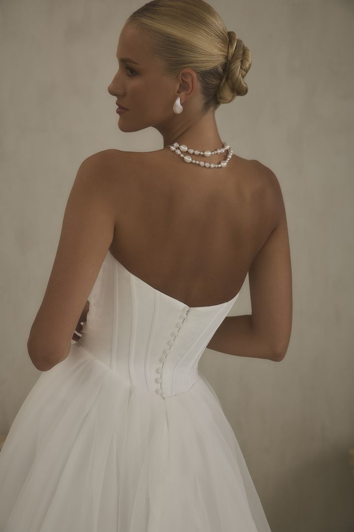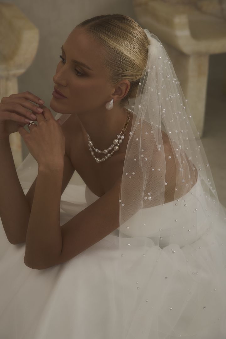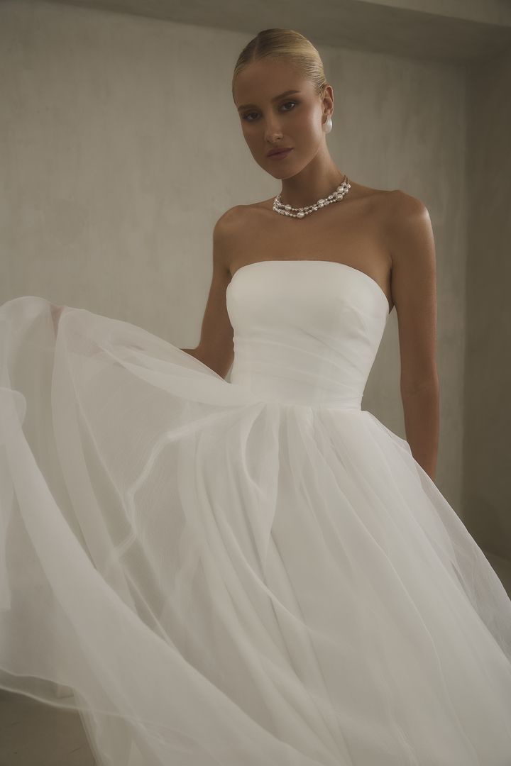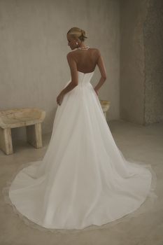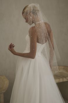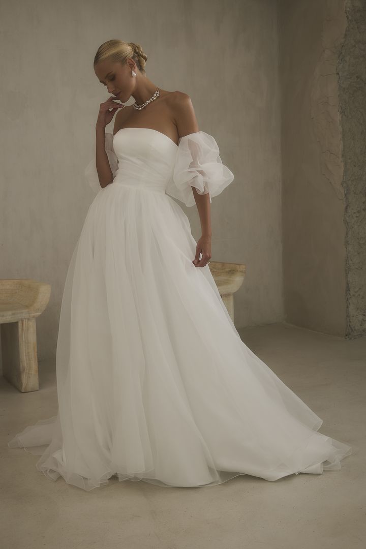 2637 Charisse radiates modern poise with a touch of ethereal softness. The straight-across neckline and sculpted, pleated bodice create a clean, refined frame, while airy layers of crepe organza flow effortlessly into a full A-line skirt. The smooth sateen satin underlayers bring a subtle, luminous sheen, enhancing the gown’s timeless silhouette. For a romantic accent, add the SL063 Charisse sleeves—detachable sheer puffs in tulle and crepe organza that drift lightly at the arms. Complete the look with the matching fingertip veil, a sheer tulle cascade scattered with delicate pearls for a graceful finish. Pair with the SL063 sleeves for whimsical romance and the pearl-scattered fingertip veil for a luminous ceremony entrance.