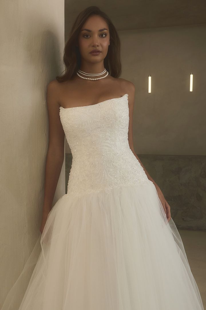 2639 Kahlan sweeps into view with regal refinement, where intricate detail meets graceful structure. The pointed scoop neckline frames the décolletage with soft sophistication, leading into a dropped waist bodice that elongates the figure. Beading and embroidery dance across the fitted silhouette, shimmering subtly with each movement. Flowing from the hips, the full A-line skirt in silky satin and airy tulle cascades into an opulent 80-inch cathedral train.