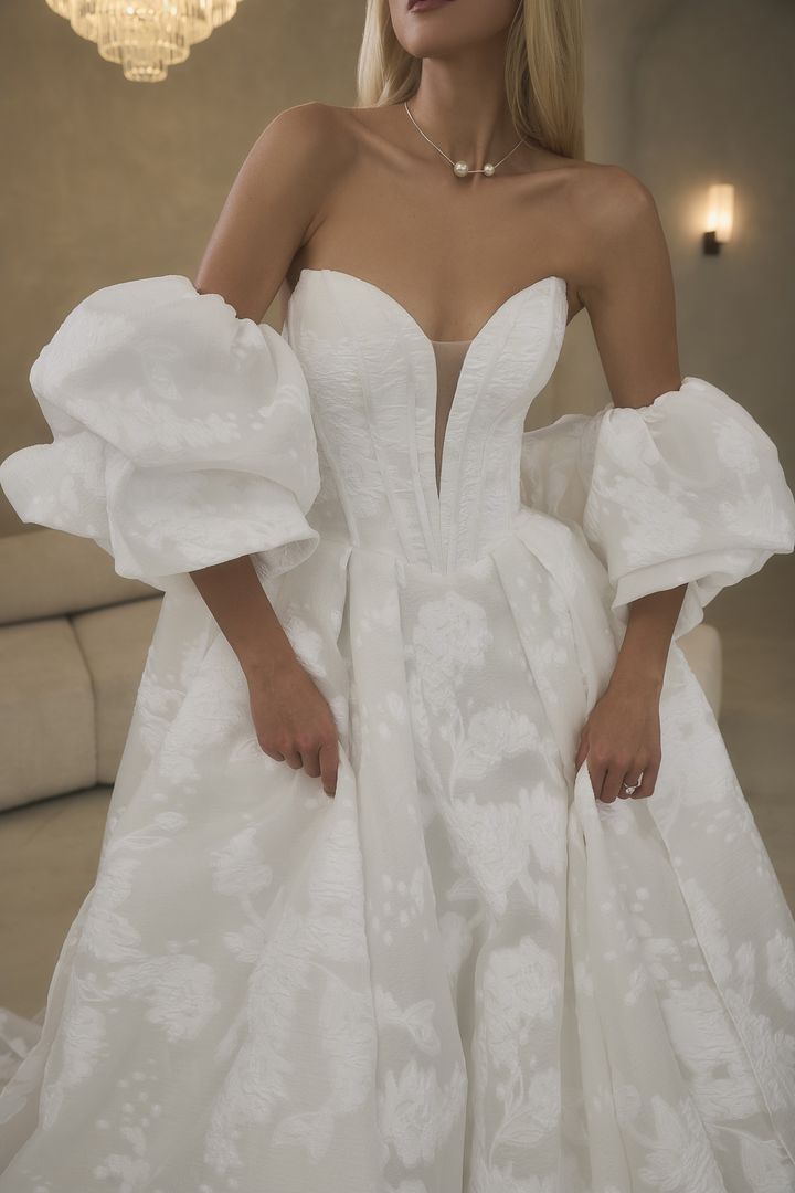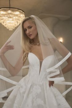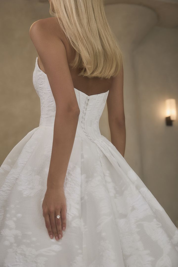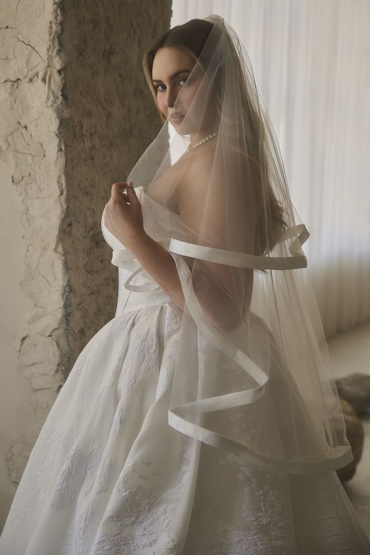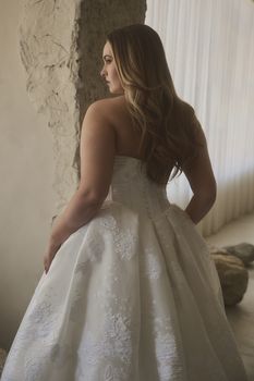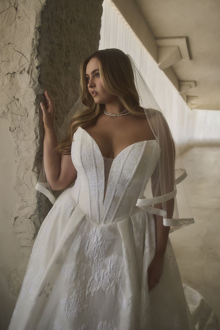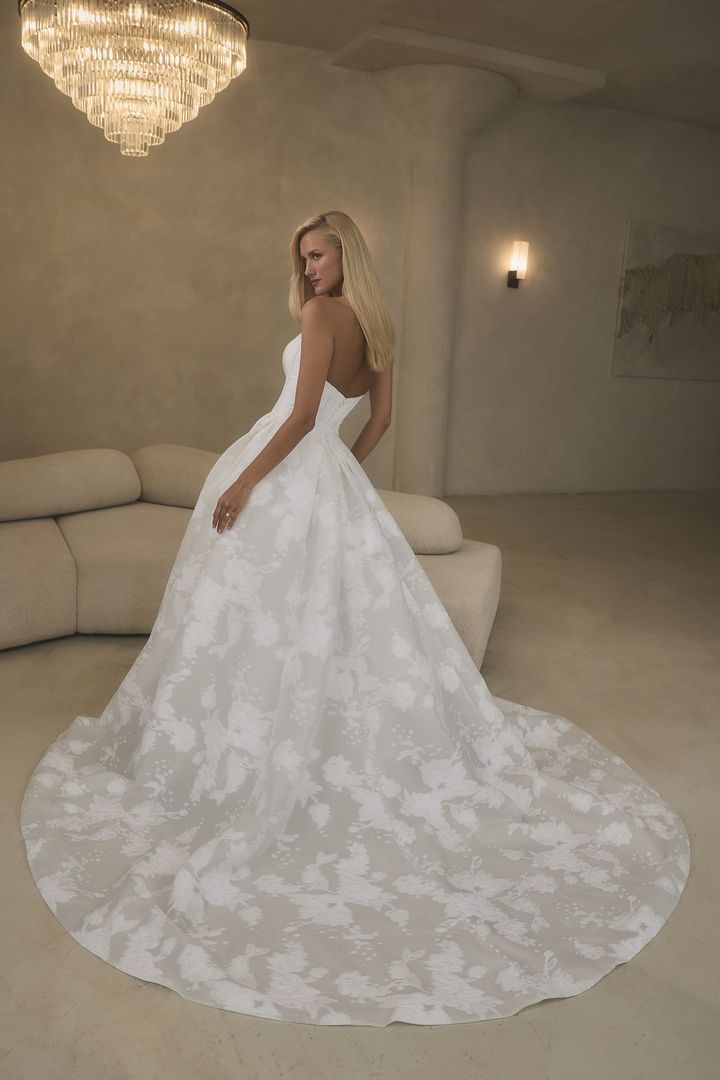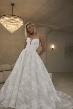 2639 Kahlan sweeps into view with regal refinement, where intricate detail meets graceful structure. The pointed scoop neckline frames the décolletage with soft sophistication, leading into a dropped waist bodice that elongates the figure. Beading and embroidery dance across the fitted silhouette, shimmering subtly with each movement. Flowing from the hips, the full A-line skirt in silky satin and airy tulle cascades into an opulent 80-inch cathedral train.