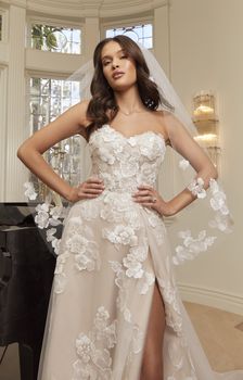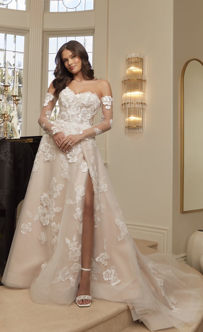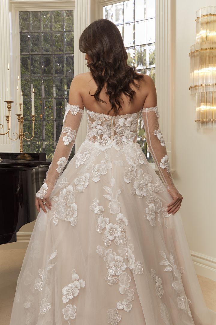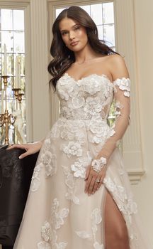 Get swept away in the fairytale romance of style 2559 Maude, a charming A-line wedding gown of elegant floral lace appliqués and tulle. Her embellished sweetheart neckline and detachable, sheer off-shoulder sleeves highlight her bodice with built in 15-point boning. This supportive structure creates a flawless fit for all shapes and sizes. From the waist, this timeless A-line silhouette softly skims the figure, opening at the thigh for a sultry leg slit. Delicate floral lace appliqués with sequins scatter across flowy layers of tulle culminating in a stunning 70-inch train in the back. Maude is also available with the option to line the bodice for a more modest look. Maude's matching accessories include detachable, fitted tulle illusion sleeves (SL045) and a matching fingertip veil, 2559V, offered separately.