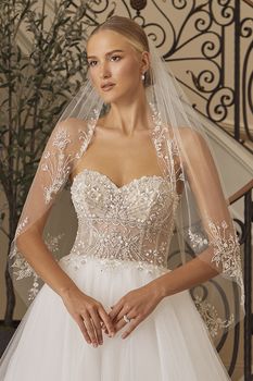 Style 2576 Audrey is perfect for modern brides with an eye for sparkle. Cut from ivory tulle embellished with handcrafted beading, this voluminous ballgown is traced with sparkling crystals at the bodice to complement diamond engagement rings. With exposed 10-point boning, this gown offers structure and support while the sheer bodice and sweetheart neckline make a flirtatious statement. As if that isn't enough glamour, this wedding dress is complete with a luxurious 70-inch train. For added versatility, Audrey features detachable beaded straps offering many different looks including: strapless, cap sleeve, or off-the-shoulder. Add lining for a more modest ensemble, and pair with her matching fingertip veil, 2576V, offered separately.