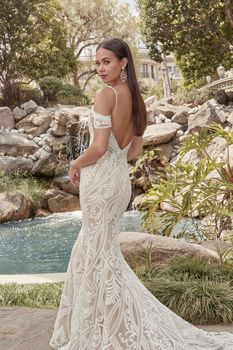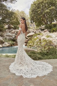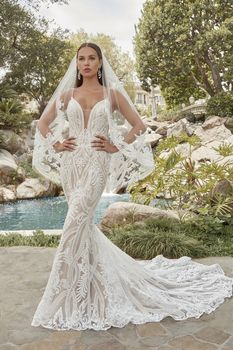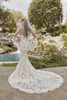 A wedding dress suited for a bohemian goddess, Style 2502 Francesca is a sultry fit and flare gown in stretch chiffon, designed to sculpt a bride's every curve. Bohemian lace with sequins is a vision of free-spirited romance, with whisper-thin spaghetti straps and detachable off-the-shoulder sleeves. The romance continues with Francesca's 80" train, and matching veil 2502V for a wedding day look made for everlasting love.