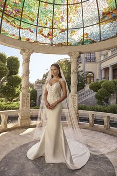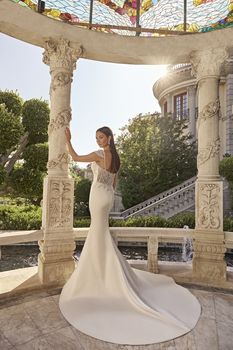 Vintage glamour meets modern sensuality in Style 2515 Nicola, a show-stopping fit and flare wedding gown meticulously tailored in Italian duchess silk. Thoughtfully placed beading and embroidery enhance the sleek bodice from the spaghetti straps with detachable beaded detailing to the sculpted v-neckline. Turning around, the intricate beading continues throughout the back of the dress before flowing into a sleek 74" train. Pair with matching cathedral veil 2515V for an extraordinary ceremony or camera-ready look.